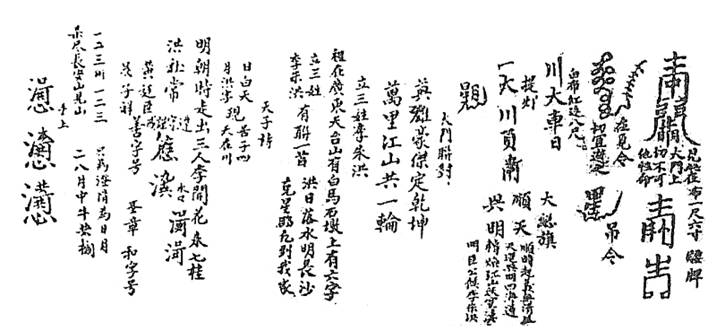天降考场 , 皇风吓风遍地慌。一连几省遭魔障 , 虚无两个遭冤屈 , 死转故乡。也是天意 , 借考贤良 , 试众智慧 , 谁弱谁强。考众道念 , 谁柔谁刚 , 三乘九品 , 谁上谁下。修行高低 , 自现肺肠 , 无根种子 , 生毁生谤 , 破戒开斋 , 说短道长 , 考出这些诸模样 , 以便龙华定主张 , 可怜几省遭刑杖 , 一连几载受灾殃。几多头顶改志 , 几多大善变行藏。几多连齐不认账 ,几多嗔谤在心旁。几多只顾己无恙 , 几多肯在道上忙。好好歹歹多般样 , 一笔写不尽端详。肯卫道的天旌奖 , 不卫道者自凄凉。说之不尽也不讲 , 单照紧处劝承当 ,调贤吃紧莫放荡 , 叫他小心守戒墙。愿忏时时要答上 , 自己谨慎自加忙 , 大道不久要明朗 , 财上疎些又何妨。那时功圆泉满爽 , 高增菩提上品堂……28