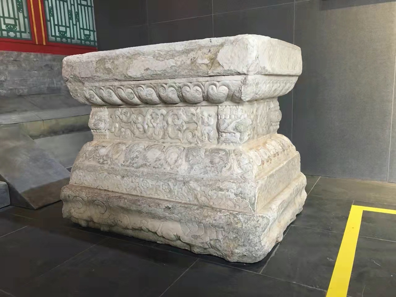 “露天陈设器物座”,俗称“露陈墩”、“露陈座”。多为汉白玉雕凿而成,立面多以“工”字形的须弥座形制为主,通体雕饰花纹,是庭院陈设中特有的一种景观设施。露陈座由须弥座演变而来,却又自成体系。它们一般不会独立陈设,而是与其上的铜铸陈设物或石雕盆景等装饰物相匹配,但由于这些装饰物大多在历史的变迁中遗失,而露陈座则因不易搬运得以在多次浩劫中保留下来。如今这些露陈座以其精美的造型和纹饰已经成为可独立观赏的艺术品。