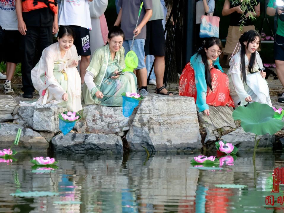 傍晚,身着汉服的游客聚集在圆明园春泽斋岸边,缓缓放下荷灯,点点荷灯随风漂向远方,寄托着大家对美好生活的祝愿,将主题活动推向高潮。如今正值圆明园第二十八届荷花节期间,“相聚圆明·爱在七夕”主题活动的举办将为“进一步讲好圆明园故事,挖掘圆明园传统历史文化价值”增添新的气息。
