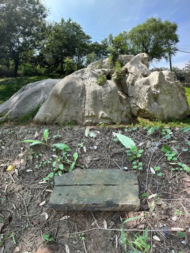 始建于1953年的紫竹院公园,没成想也能找到带有戳记的大墙砖,只不过位置较为隐蔽。揽翠亭下转弯处,一摞叠石之后,一堵大墙砖赫然在目,长而且厚。跃过叠石,猫腰察看,果然带款,可恼字迹模糊,无法辨识。