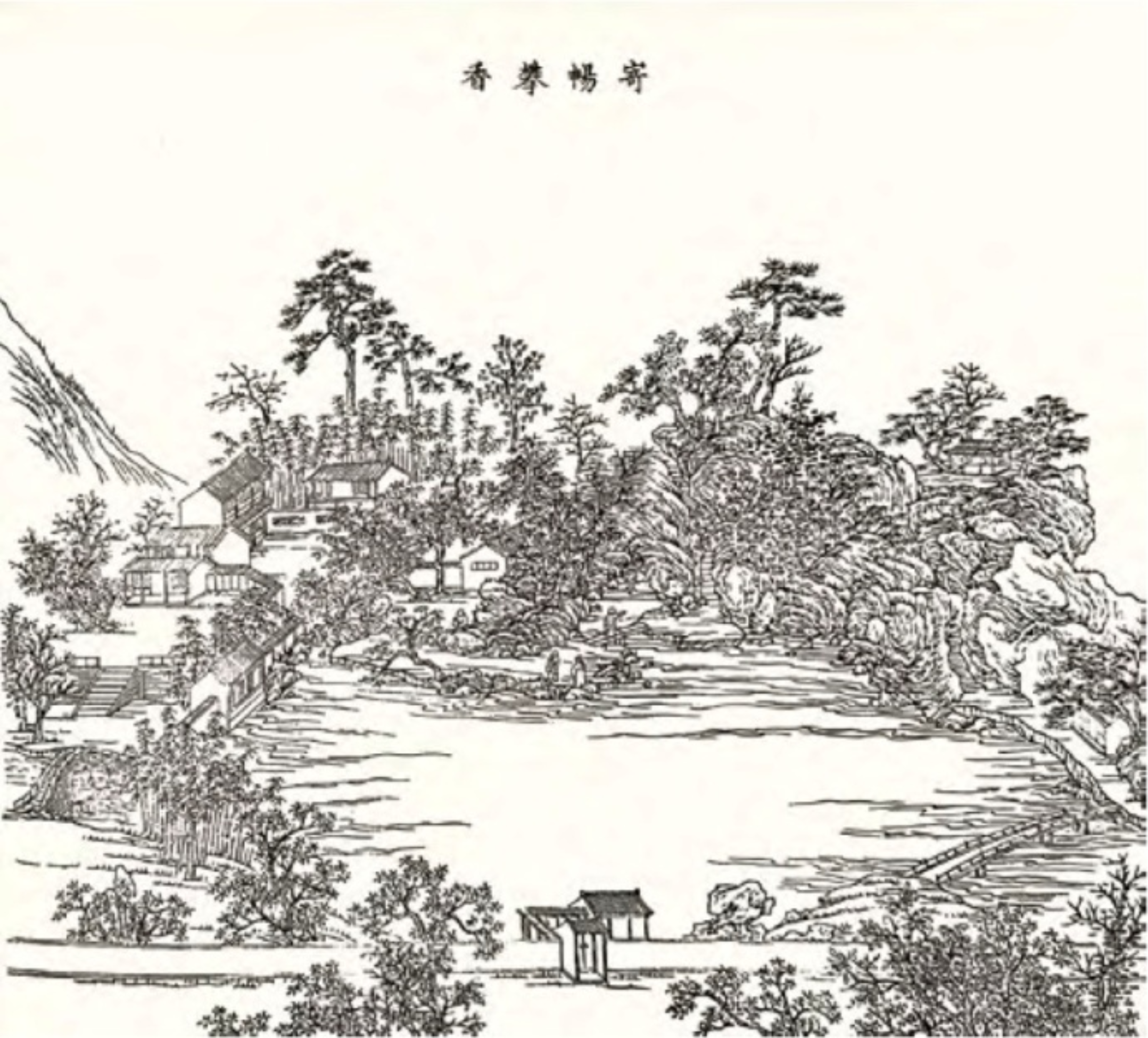 《焕文写像》一图描绘了半亩园中云荫堂正对的玲珑池馆一侧的景象,图中可见《半亩营园》图像中出现过的方池,其驳岸为山石组成,并且层层叠加,层层退隐,形成了近水面处的幽深岸线。岸边围以栏杆,前景山石峭立,方池隔一段平缓堤岸,后侧可见一段自然式的溪流,溪流上架有平桥、曲桥各一座,溪水两岸山石错叠,灌木布局其中,玲珑池馆即位于山石后侧高起的平台上,远景处山石耸立墙边,形成水源无尽的观感(图3)。整幅画面池沼形成主景,并以叠石、水体、建筑与林木之间的虚实结合,组成山水悠远的园林景致。与半亩园营造提及的“垒石成山,引水作沼”不同,麟庆游览无锡名园寄畅园时,也曾有过“垒石为沼”的描绘。《寄畅攀香》篇载:“入门即知鱼槛,依槛垒石为沼,其水从寺而左,淙淙㶁㶁注为清渠,沿沼过桥,为嘉树堂。”清初寄畅园曾经过改筑,改筑后的面貌可见《寄畅攀香》一图,图像前景中的园门,入门后一小段游廊连接的即知鱼槛,槛前正对一处开阔的水面,水池四周山石林立,树木葱茏,并且由数座小桥横架水面(图4)。水岸边缘山石或耸立成崖,或立石成矶,还有一部分形成竖直驳岸,山池面貌形成土山为主、错之以石的“平冈小阪,陵阜陂陁”,延续了明末清初张南垣“张氏之山”的典型风格。
