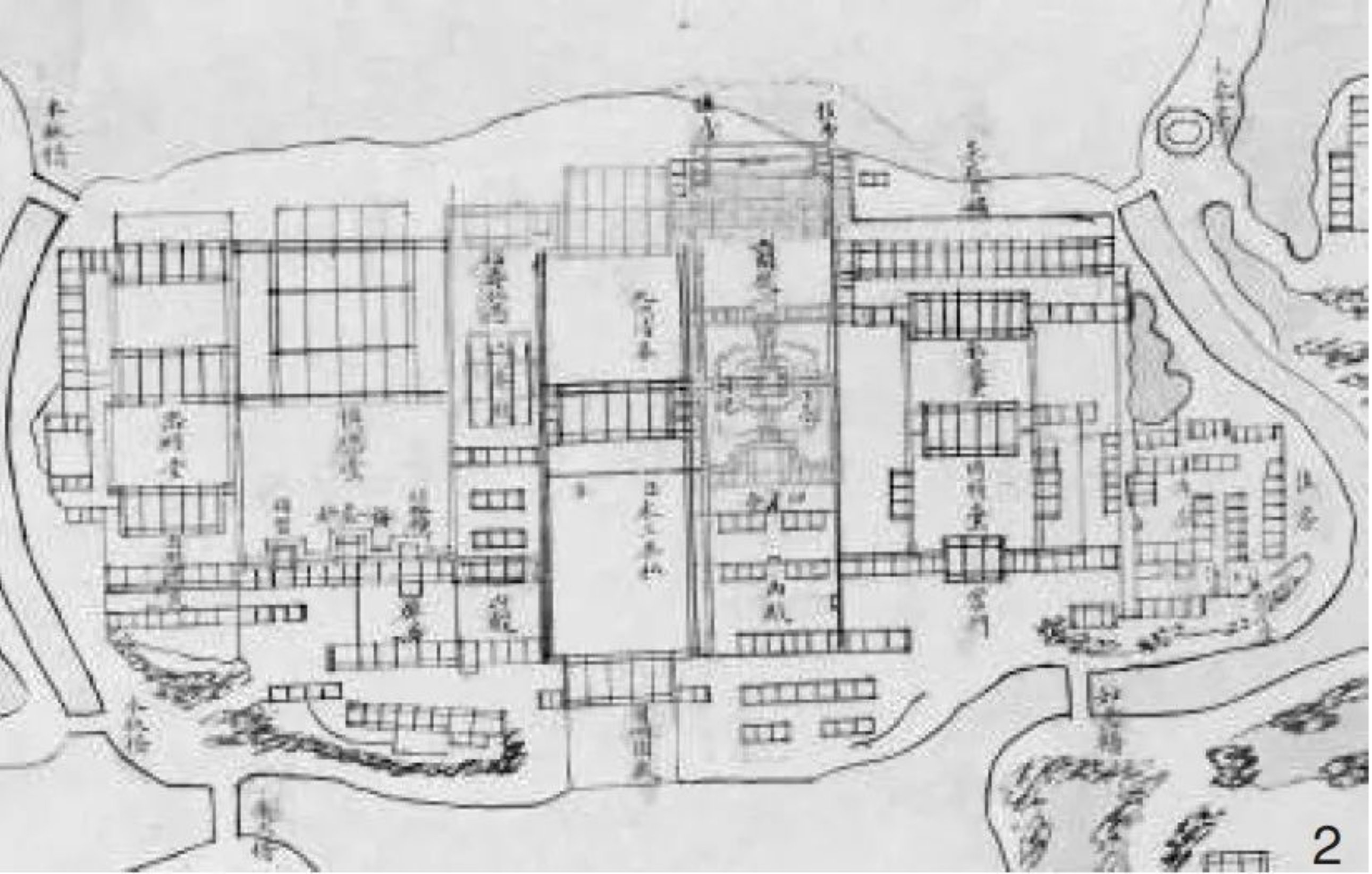 关照本图仅有“慎德堂”西侧游廊已呈现咸丰八年(1858年)变更后的格局,其余史料中记载被改变的建筑或被遮盖,或被红色线条涂改,几乎无法辨识与档案是否吻合。而其中红色线条描绘的建筑集中在“九州清晏”景区,包括:“慎德堂”北端第四进深、“同道堂”、“同道堂”前戏台、“九州清晏”殿,东路方亭、游廊以及后罩殿。查阅档案及图纸可知,其呈现的格局与同治重修期间的过程方案相符,因而可以断定,红色线条应绘制于同治十二年(1873年)到十三年(1874年)间。此外“九州清晏”景区也已出现同治朝重修工程中变更后的殿宇名称,如“思顺堂”“承恩堂”等,这一事实也佐证了上述结论,那么是否可以由此推断本图绘制时间不早于同治朝呢?显然,尚不能如此断定。正如前文所述景点题名似乎为后期标注,若如此,须进一步核实底图的初始绘制时间(图2、3)。