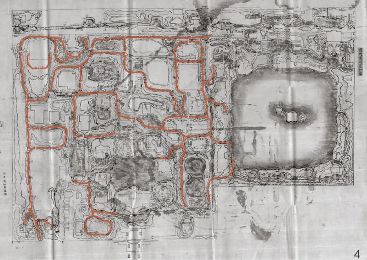 事实上,在3幅图样中,043-003图面线条最为潦草,河道尺寸用红色字迹标注,沿岸际描绘的登岸码头几乎遍布所有河道,粗略统计约有300余座,由此可推知游船几乎通达园中任意景区,而沿途所有桥梁均应可以通行,这将是研究圆明园桥梁艺术的重要线索。此外,图面部分河道留有连续的红线,并且在图面左侧注明“河中有红道高水”,应是对红线的说明,依据红线我们重绘出圆明园河道水位布局(图4)。再有,图面仅有一张贴签,注明“圆明园河道全图”,为3图中唯一阐明图纸题名的图样。