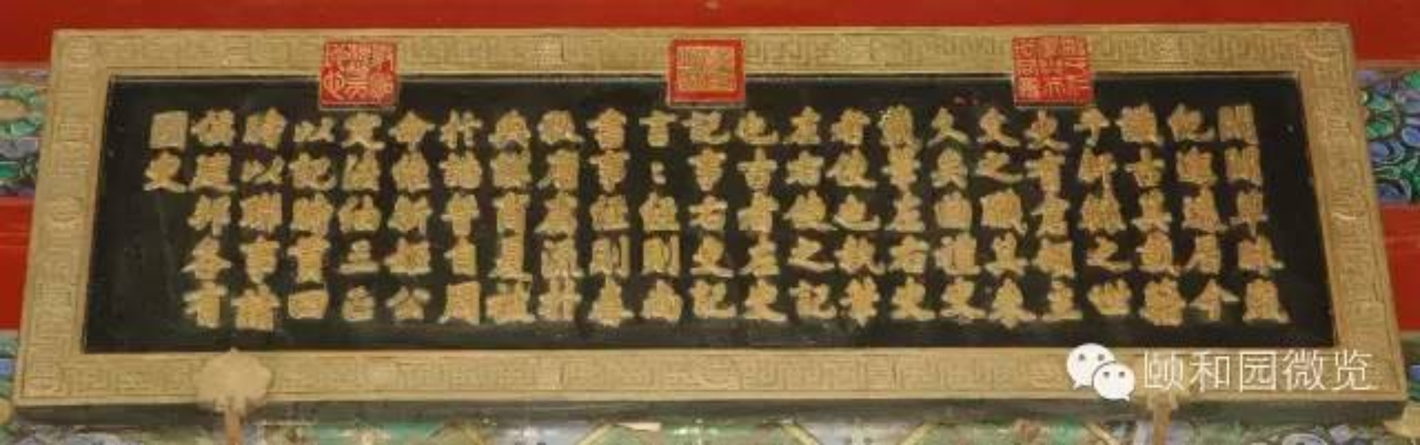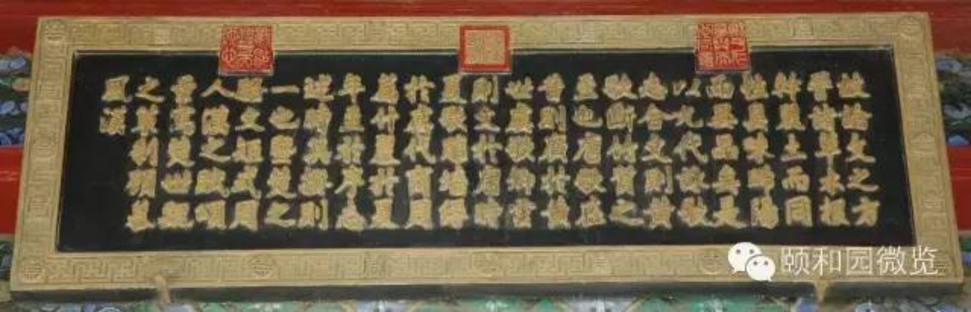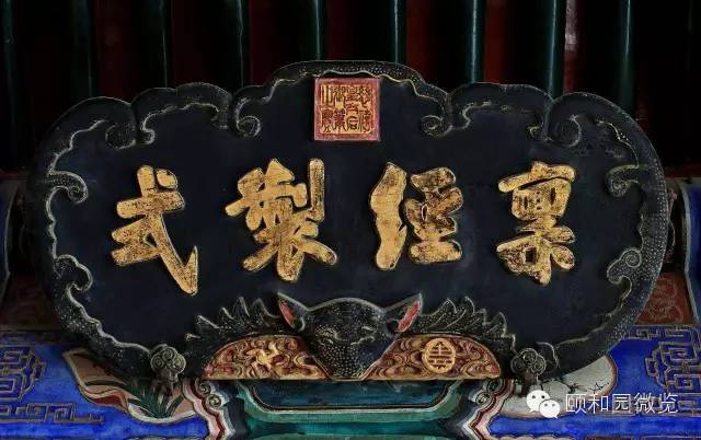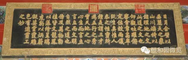 颐和园内的木雕金字横匾,除殿堂、亭、楼等景物名称外,还有数量更多的副匾,这类匾的文字内容可概括为:表述景观主题、彰显道德崇尚、抒发意蕴文采、援引典故源流、倡导风雅教化、暗合使用功能等。它们与正匾相配,恰到好处地使一区景观的内涵更趋饱和丰满;也使景观画面中的建筑物眉目更为清楚,形象更趋典丽。因此,这些匾上的文字,无一不是引经据典,其中绝大部分只有四个字。虽然区区四字,要准确解读,往往要数百字、上千字的演绎,始可说明清楚。除了这些四字匾以外,还有以诗文为内容的木雕金字匾,匾上的文字多达百余字以至数百字,典型的是悬挂在廓如亭(八方亭)内檐上的八块匾,其中两块为乾隆御笔的御制诗,均系万寿山昆明湖的揽胜之作;其余六块,内容则皆引自我国古代文论名著《文心雕龙》。这种集中引用一位作者、一部著作的“匾文化”现象,在园林中概不多见。
