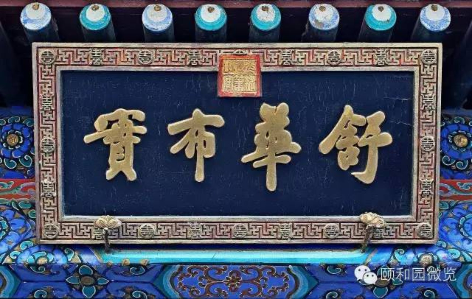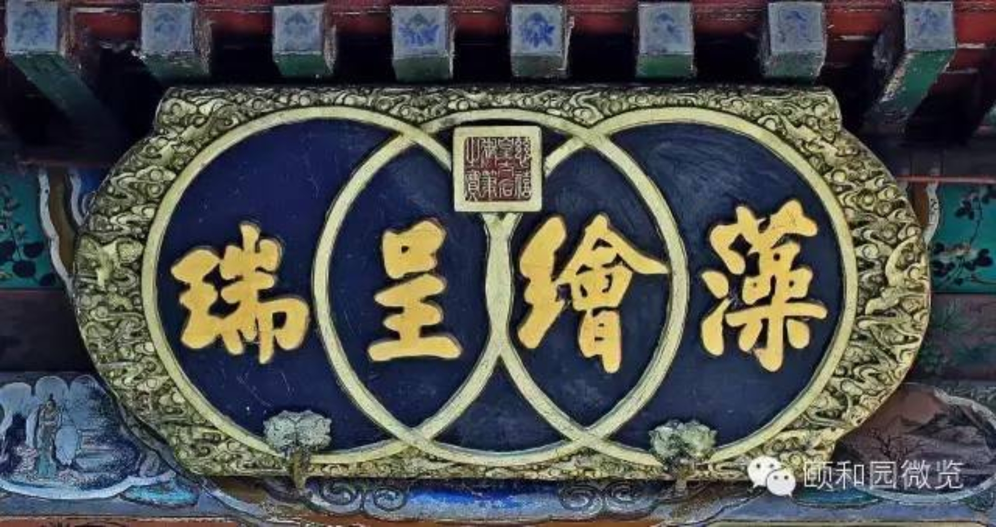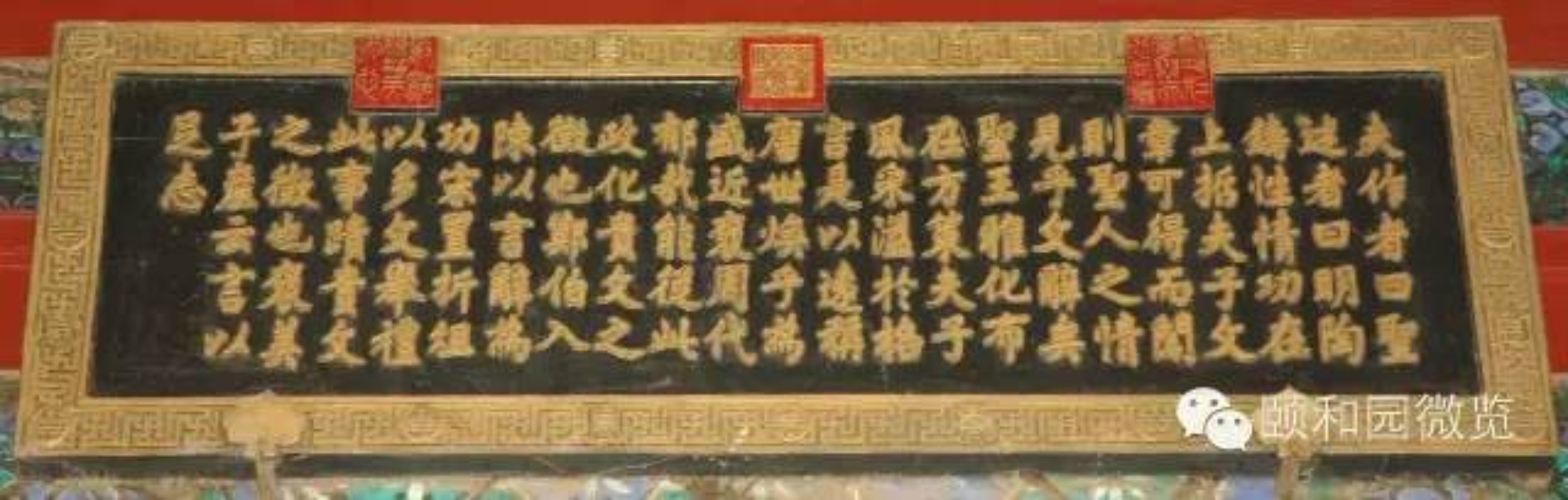 颐和园内的木雕金字横匾,除殿堂、亭、楼等景物名称外,还有数量更多的副匾,这类匾的文字内容可概括为:表述景观主题、彰显道德崇尚、抒发意蕴文采、援引典故源流、倡导风雅教化、暗合使用功能等。它们与正匾相配,恰到好处地使一区景观的内涵更趋饱和丰满;也使景观画面中的建筑物眉目更为清楚,形象更趋典丽。因此,这些匾上的文字,无一不是引经据典,其中绝大部分只有四个字。虽然区区四字,要准确解读,往往要数百字、上千字的演绎,始可说明清楚。除了这些四字匾以外,还有以诗文为内容的木雕金字匾,匾上的文字多达百余字以至数百字,典型的是悬挂在廓如亭(八方亭)内檐上的八块匾,其中两块为乾隆御笔的御制诗,均系万寿山昆明湖的揽胜之作;其余六块,内容则皆引自我国古代文论名著《文心雕龙》。这种集中引用一位作者、一部著作的“匾文化”现象,在园林中概不多见。