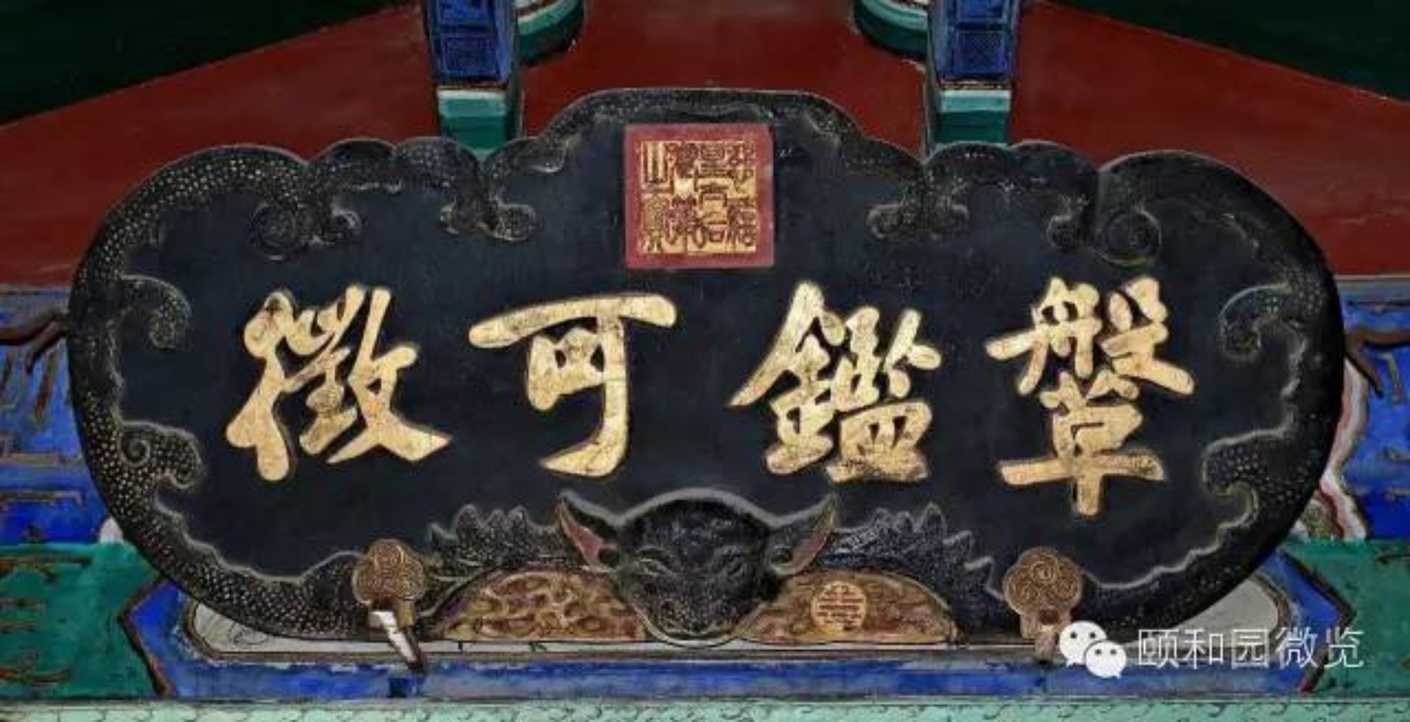 该匾悬于长廊鱼藻轩,面北。引自《文心雕龙·铭箴第十一》。原文:“……及崔胡补缀,总称《百官》,指事配位,鞶鑑可徵,信所谓追清风于前古,攀辛甲于后代者也。”释意:(原文解释铭箴之“箴”,即针也,就是扎针治病,针砭时敝的立意,夏商周三代就盛行箴这种文体,商纣的臣子辛甲曾作《百官箴》,后来散失了,后人又加以收集补充)到了东汉经过崔駰、崔瑗父子和胡广的补写,总称为《百官箴》,根据百官的权位,指出值得警示的事项,象随身皮带上装饰的铜镜,随时可以对照,规范自己的行为。这真是追慕古人的好风气,把辛甲的苦心传承到后代。“鞶鑑”就是皮腰带上装饰的铜镜,这块匾悬于长廊步入鱼藻轩的入口上方,与鱼藻轩是临水的建筑相关。
