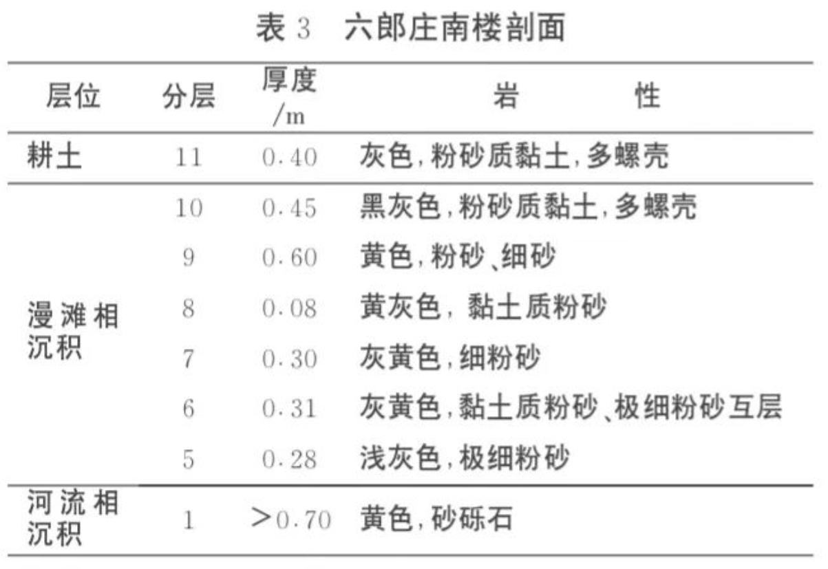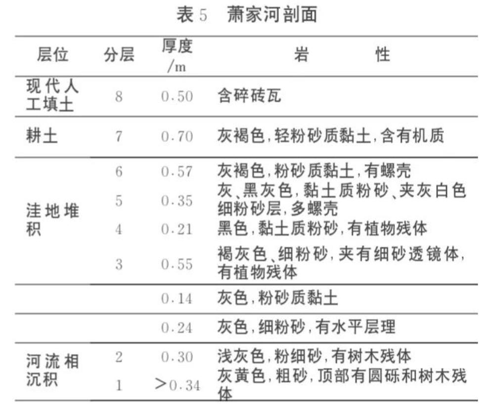 (4)上部为湖沼滩地相沉积向稻田土的转变层。颜色为灰褐色。岩性为黏土质粉砂,含有螺壳和植物残体,上部含有碎瓦片。