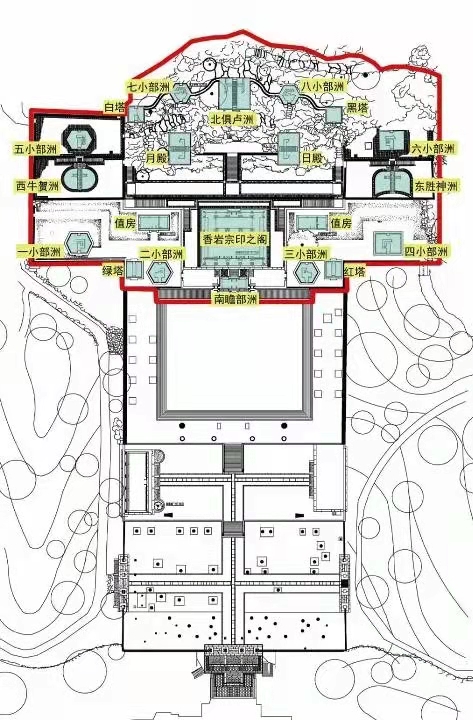 颐和园四大部洲建筑群位于颐和园万寿山后山中路(图绪-1),坐南朝北。殿宇自山顶沿北坡逶迤而至山麓,南北长85米,东西宽130米,总占地面积约11050平方米。四大部洲建筑是建在高台坡地上,分台建造。按照佛经记载世界中心是须弥山,须弥山周围有四大部洲、八小部洲等十二块陆地,皆为人类生存之地,并为大海所环绕,海外尚有铁围山,此组建筑群极赋有象征全部佛国世界的意义。建筑布局应用了象征主义手法,追求艺术上的极致,众多的单体建筑高低错落,各具特色,是古代建筑艺术上的经典范例。