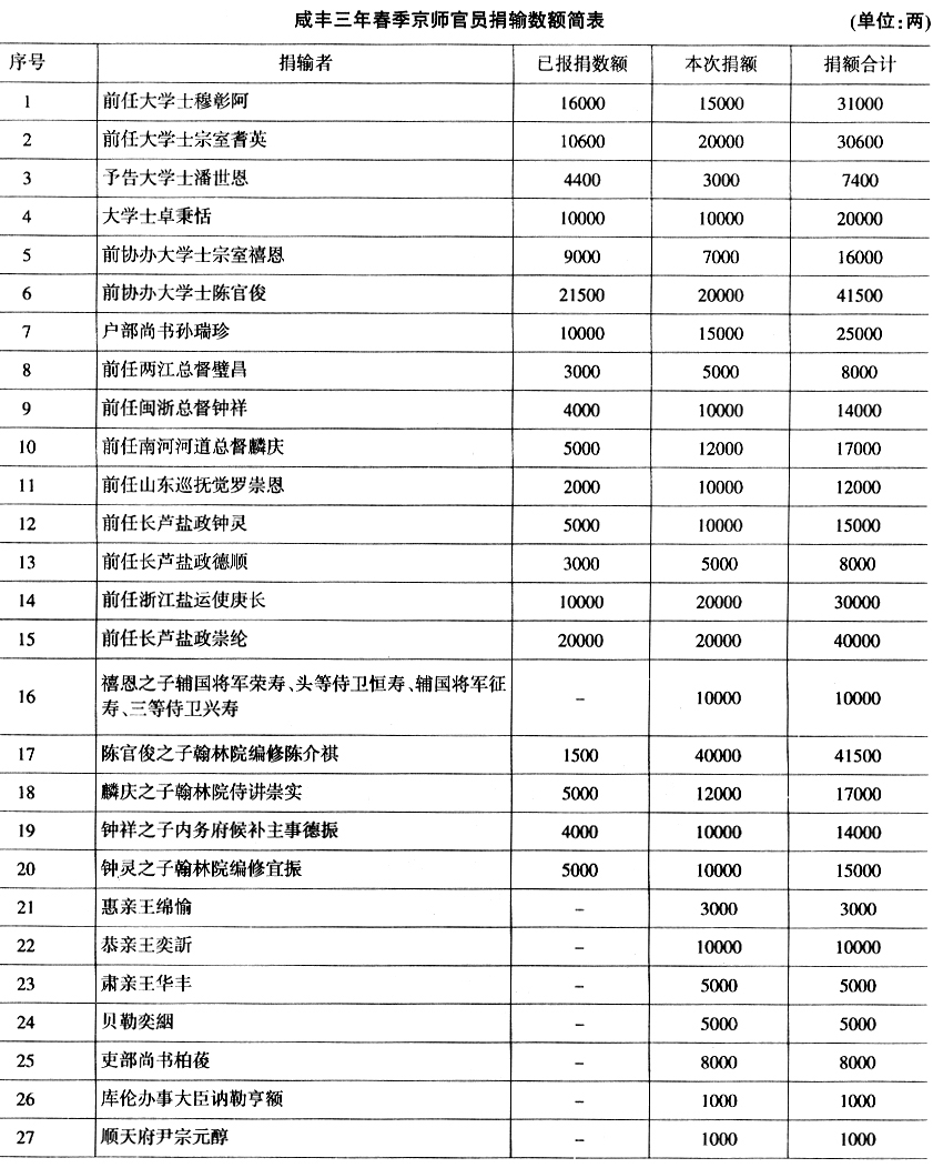 上述官员捐献实银总额为446000余两,其中本次捐献数额为297000余两。就京师官员捐献而言,不足称道。(69)
