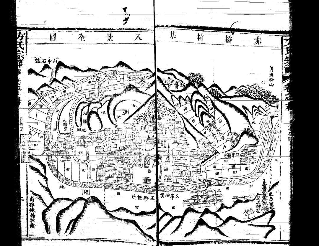 在自然环境与宗法、科举等文化的共同影响下,明清时期的徽州村落空间本身具有一定独特样态。如此样态在村图中亦有所反映,使得观看者能够大致得知村落的空间布局。但村图毕竟不是村落的空间效果图,在空间结构方面,村图中的样貌与实际情况并非完全一致。这种情况并非是明清徽州编谱者的创造,而是中国古代地图的一种通例。实际上,为服务于宗族对于村落历史与现实的记载,村图的中的空间结构明显偏向于与宗族相关的内容,并在空间等级与空间边界上有着突出的表现。