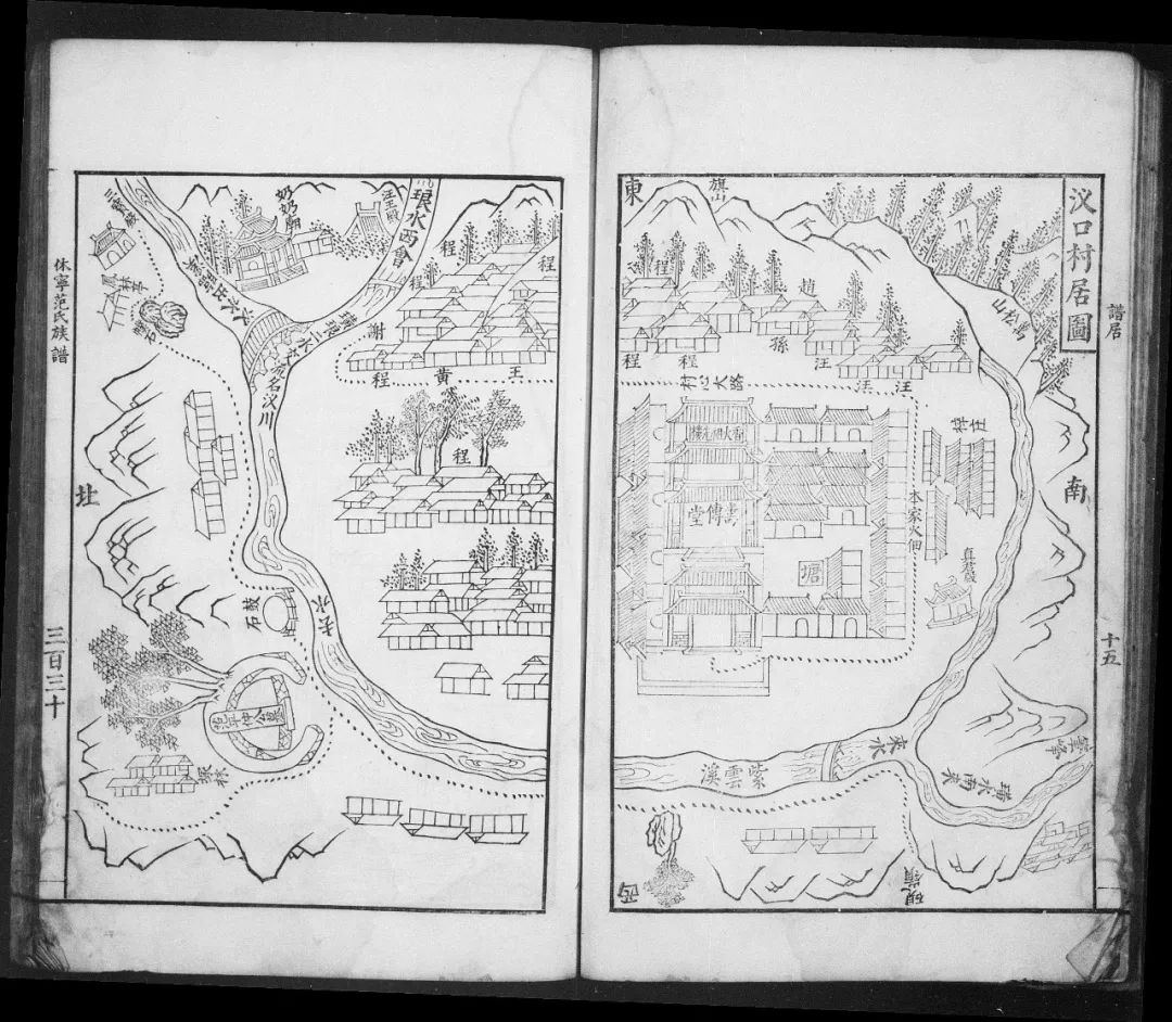 明清徽州是一个典型的宗族社会,姓氏各异、支派不同的宗族在两朝近六百年的时间里纂修了大量的谱牒,流传至今仍有两千余种。这些家谱大多体例完备,内容详实,且载有多篇不同种类的图像。大体而言,谱中图像包罗人物、坟茔、建筑与村落四类内容,它们与文字一同构成了宗族书写的自身历史。其中绘制村落者,即本文所论之村图,在家谱中被冠以基图、基址图、阳宅图等名称。这些村图主要是从宗族视角出发,记载村落的人文居住信息,其篇幅一般较大,并非存在于所有家谱当中。它们多采用传统地图的绘制之法,且在一定程度上受到徽派版画的影响。同时,在直观上,谱中村图与方志、鱼鳞图册等文本中的图像亦有着类似之处。在此情形下,村图与现代意义上的村落地理图有着较大的区别,并不能科学、精准地反映村落的地理信息,也正因此,使得家谱所载的这些村图具有了图像之外的意义,而对于这些村图本身样态与存在目的的分析,则可成为认识徽州宗族自身历史书写的一种辅助。但就研究现状而言,张国标、张秀玉与鲍国强等人对家谱所载村图有所论述,观察的样本数量与研究角度均较为有限。有鉴于此,本文在广泛搜集家谱所载村图的基础上,直观展现村图所绘内容,并尝试对其存在意义进行分析,祈请方家指正。