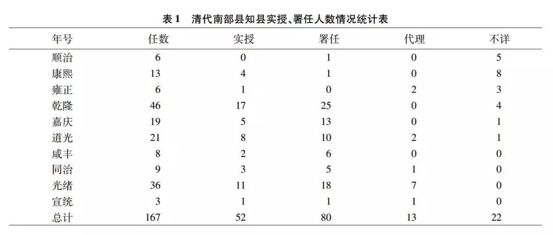 清代南部县知县的任期如何呢?以往无现存的系统数据。笔者根据《南部档案》《道光南部县志》《同治增修南部县志》《南部县乡土志》《南部县志》《缙绅录》《申报》、南部县的田野资料及相关地方志等文献逐条考证,整理出相关数据。