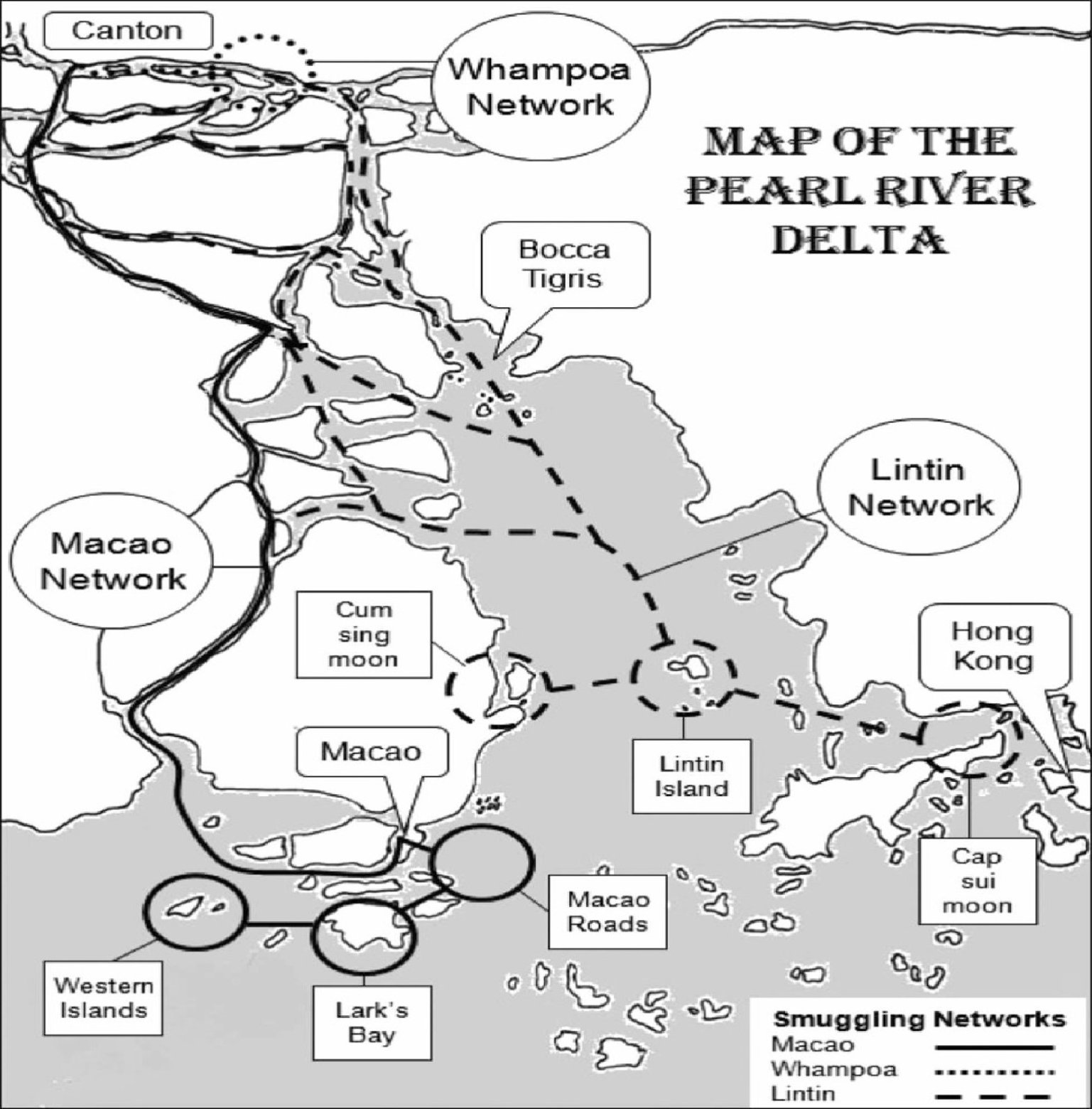 Carl Trocki研究的数据显示, 1800~1830年间, 中国的鸦片走私达到3000~5000箱。它们是由允许每年一次到中国贸易的外国船只运送的。然而, 在内伶仃岛港作为供给点建立以后, 鸦片走私贸易迅速地由1820年的4244箱升至1832年的20000箱。在1838年, 数字涨到了400000箱。 (2) 到内伶仃岛的中国商船经常走私鸦片, 他们将鸦片运到中国沿海的各个港口。 (3) 鸦片也从中国出口。例如, 1782年行商Sinqua出口鸦片到马六甲 (尽管在这个例子中, 大部分的鸦片最终运回中国) 。一个名为Luis Barretto的商人从珠三角出口鸦片到马尼拉, 他将鸦片偷偷运送进去, 因为那里是禁止鸦片交易的。 (4)