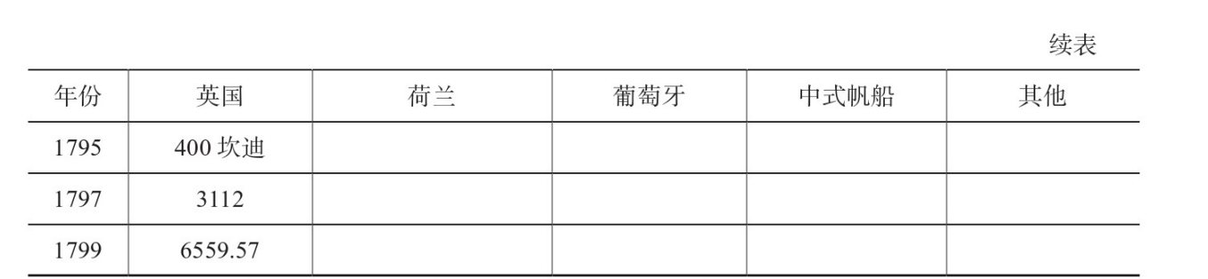 (103)嘉庆四年(1799)十一月,总督吉庆奏言:窃査各外夷来粤贸易船只,惟英吉利船大货多。嘉庆十九年(1814)十月,两广总督蒋攸钙、监督祥绍疏:查南洋诸夷,以英吉利为最强。梁廷枏:《粤海关志》,第512、563页。