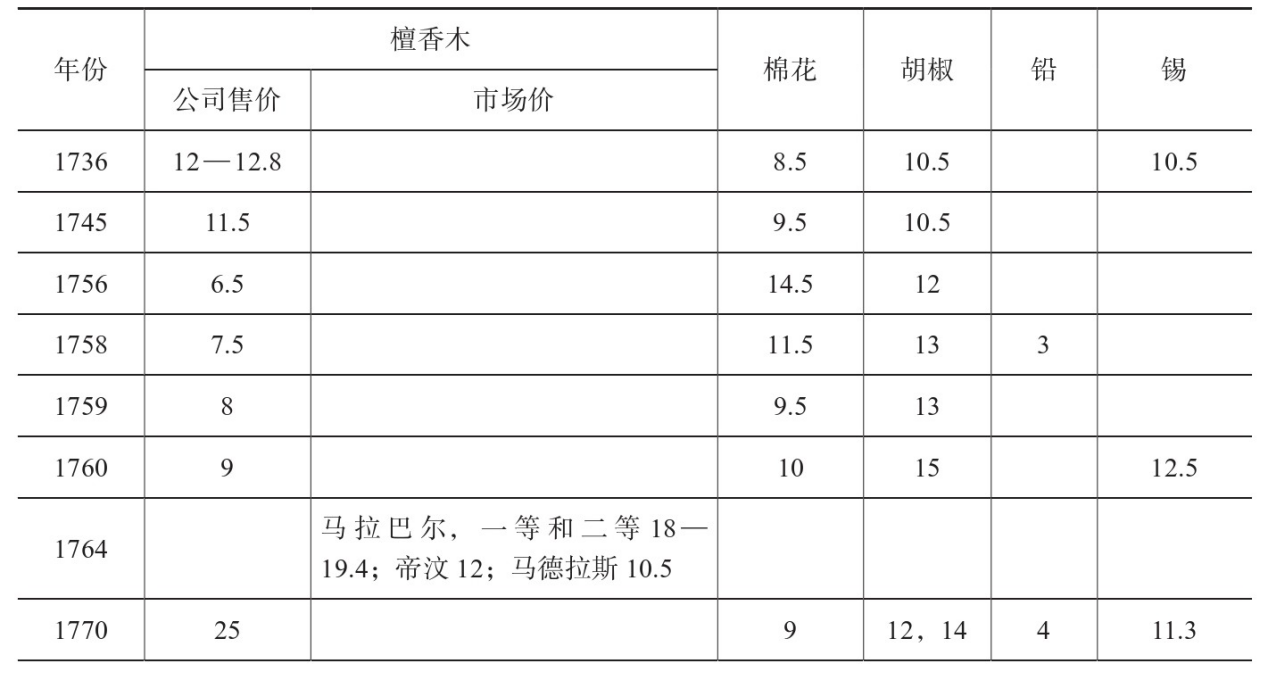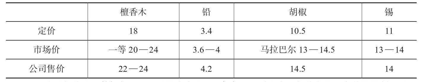 注:公司售价这组数据与马士记录的略有出入,但都可以看出实际售价突破了定价的限制。马士记录,胡椒14.2两、锡14两或更高、铅4两。这三者此前的定价分别为10.5两、10.5两、3.6两。资料来源:lOR,G/12/61,1776.12.31,pp.28-29;R/10/8,1776.12.27,pp.141-142;Hosea Ballou Morse,The chronicles of the East India Company Trading to China,1635-1834,Vol.2,p.22.