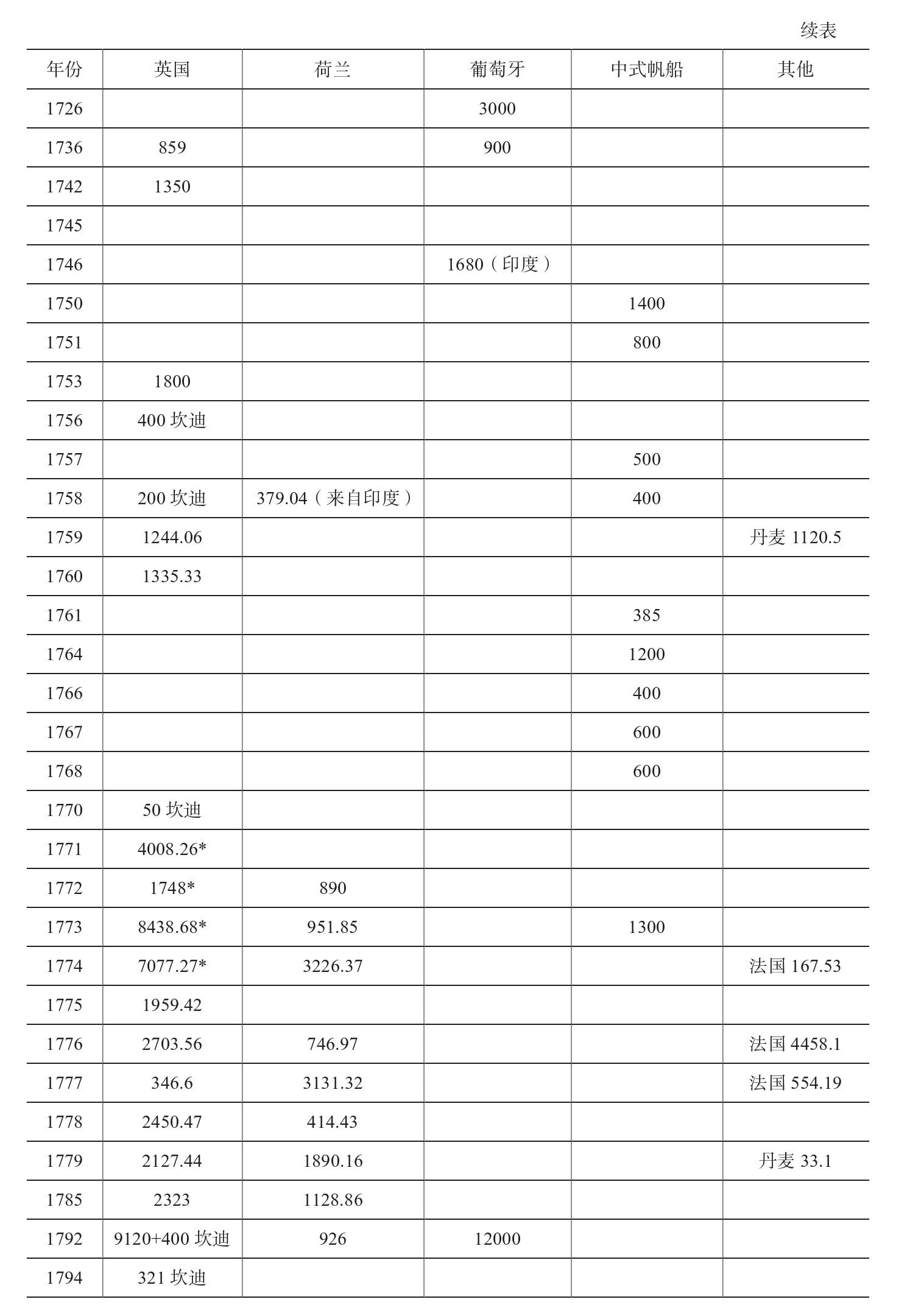 注:1.英国包括了东印度公司和散商。英国运来的檀香木基本来自印度,法国运来的檀香木可能也来自印度。坎迪是印度重量单位Candy。2.荷兰和葡萄牙运来的檀香木主要来自帝汶,少量来自印度.整个18世纪澳门与帝汶之间每年往返船只约1一3艘,但运载檀香木的具体数量缺乏记载。3.中式帆船输入的檀香木来自巴达维亚,主要是帝汶檀香木。丹麦大班曾使用中式帆船在巴达维亚运载帝汶香木数据是范岱克从荷兰东印度公司档案中统计得出的。4.*年份数据与马士统计数据不一致。1771年,马士统计为3865担。1772年马士统计为1748担,但通事统计为公司6699担,散商5担。1773年马士统计为1734担。1774年马士统计为1783担,但通事统计为公司4668担,散商4165担。资料来源:IOR,G/1240,1736.08.20,p39;R/10/41756.07.24,p44;1758.07.29,p.72;1759.09.04,p.106;1760.11.08,p.110;R10/7,1770.07.06,p5:R/10/9,17711105,pp63,73;1772.1120,p.201;1773.02.15,pp.212-220;1774.231,pp113-121;G/12/58,1776.0129,pp186-195;G/12/61,1777.03.03,pp32-41;G/12/62,1778.0131,pp.138,140,144-145;G/12/64,1779.03.07,pp139-148;G/12/67,1779.11.30,pp.11-17;G/12/83,1786.02.24,pp142-143;G/12/265,1793.1221,no page numbers;G/12/103,1792.09.23,p.49;1792.101,p.76;G/12/108,1795.02.27,p.230;G/12/110,1795.06.25,p.41;G/12/119,1797.12.29,p.36;G/12/126,1799.12.29,p.238;Hosea Ballou Morse,The Chronicles of the East India Company Trading to Ciina,1635-1834,Vol1,pp.238,283,293;Vo12,pp.31,201-202;Vol.5,pp.166,170,176,189,191;张廷茂《明清时期澳门海上贸易史》,第293-295页;郭姝伶:《檀香木之路:明清时期澳门与帝汶的檀香木贸易及其影响(1557-1844)》,博士学位论文,澳门大学,2020,第107-112页;刘勇:《近代中荷茶叶贸易史》,中国社会科学出版社,2018,第208-241页;PaulA.Van Dyke,Merchants of Canton and Macao:Politics and Strategies in EighteenthCentury Chinese Trade,Hong Kong UniversityPress,2011,Plate 09.06,p.241;Appendix 4A-F,4l,pp.263-282.