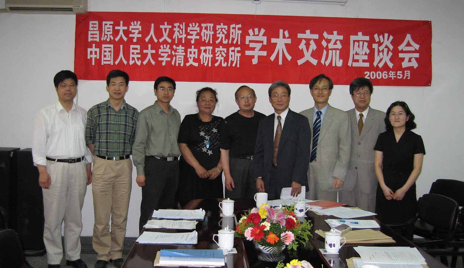 左起依次为:华林甫教授 杨念群教授 黄兴涛教授 张研教授 郭成康教授 张成镇教授 董成植教授 具山佑教授 安允儿博士(翻译)