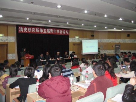2007年12月15日,中国人民大学清史研究所第五届青年学者论坛在逸夫会议中心第二报告厅隆重召开,会议由中国人民大学清史研究所学生社团清风学社主办。著名历史学家、国家清史编纂委员会主任戴逸先生,著名历史学家、中国史学会会长李文海先生,清史所教授王道成先生、清史所所长成崇德教授出席会议并发表了热情洋溢的讲话。常务副所长黄兴涛教授、清史所刘凤云教授,曹雯老师,历史学院分党委书记方玉萍老师等也出席了此次会议.