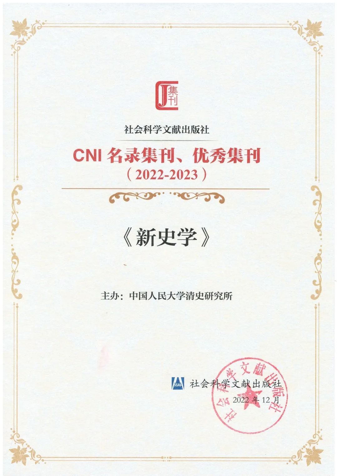 我所主办的《新史学》集刊入选CNI名录集刊(2022-2023),同时获选优秀集刊(2022),特此祝贺!