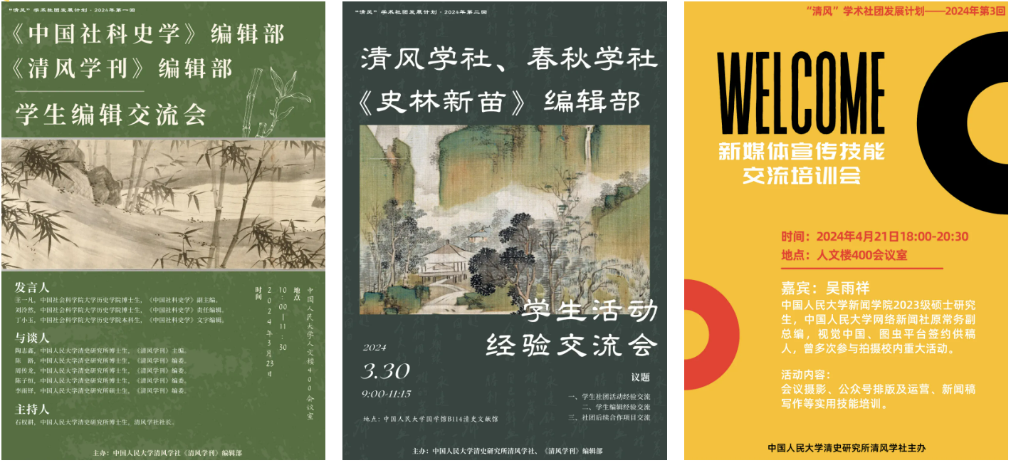 此外,本届理事会还致力于培训社员工作技能、增进社团间合作交流,使学社向更有活力、更有深度、更有影响力的方向发展,为此新设“清风学术社团发展计划”品牌栏目,本学期共举办3场专题活动。2024年3月23日,《清风学刊》编辑部与中国社会科学院大学《中国社科史学》编辑部联合举办学生编辑交流会,共同探讨学生学术刊物的发展方向、交流办刊经验。3月30日,学社与北京师范大学春秋学社、西北大学《史林新苗》编辑部举行学生活动经验交流会,分享社团运营、活动开展与工作制度等方面的经验,并探索社团合作机制。4月21日,学社邀请到中国人民大学网络新闻社原常务副总编吴雨祥同学讲授会议摄影、公众号排版及运营、新闻稿写作等实用活动技能。以上活动在扩展学社对外知名度和影响力、提升社员综合素质等方面初具成效。未来,学社将不断增加文体活动、职业规划、交友联谊等现实性、生活性活动议题,为学生提供更加多元、丰富、切实、有效的发展指导。