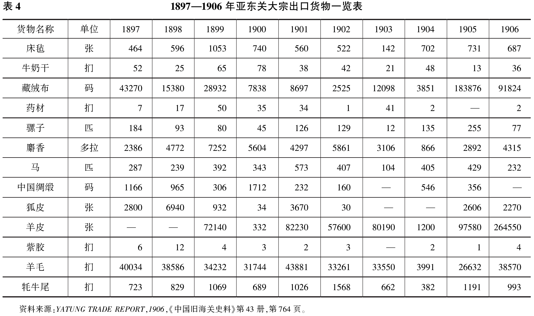如表4,1897—1906年间,经亚东关出口的商品主要为畜牧产品、手工织物和药材,而以羊毛、皮张(狐皮和羊皮)、牦牛尾等畜牧货物为主。如,羊毛出口量常年保持在3万扪左右,是亚东关最为重要的出口货物,海关贸易报告一度认为:“出口土货应推羊毛是为大宗,全仗此物为本关为第一盛旺之货,别物实难与之相提并论”;羊皮出口量除个别年份外,常年保持在5万—8万张,是亚东关与羊毛可以争胜的出口货物。藏绒布每年出口也较多,麝香出口也不少,大略次于羊毛和羊皮,也是亚东关重要出口之货。这其中,羊毛主要销往欧美市场,“羊毛出口英、美两国,商人购办者居多。”藏绒布,有论者以为销路在南亚市场,其实不然,“此项藏绒布,亦分各色,蒙古喇嘛购以作衣;殷实大家,或为鞍垫,或作车帏,取其此物结实坚固”,销场在北京、蒙古一带。麝香一度仅次于羊毛,为亚东关最为重要的出口商品之一,从亚东关出口后经海路进入广东,再经广东分销各地,“除羊毛外,大宗即系麝香,此货多系华商贩办出口,运往广东省城出售”,“麝香一项,全在华商之手,大概运往广东销售。”羊皮出口,自1899年见诸海关贸易报告后,增长较快,经海路销往内地,“此项羊皮均系运往中国”,“出口量增数最多为羊皮,目前出口为未经腌制的羊皮”,以北京为中转市场,主要在华北销售。由此可见,亚东关出口贸易,也主要依赖其间接贸易对象。同时,如果说其进口商品还有相当数量来自以印度为主的直接贸易对象,直接贸易对象在亚东关进口贸易中还有一定地位的话,那么,其出口贸易,可谓几乎全为间接贸易对象的天下。
