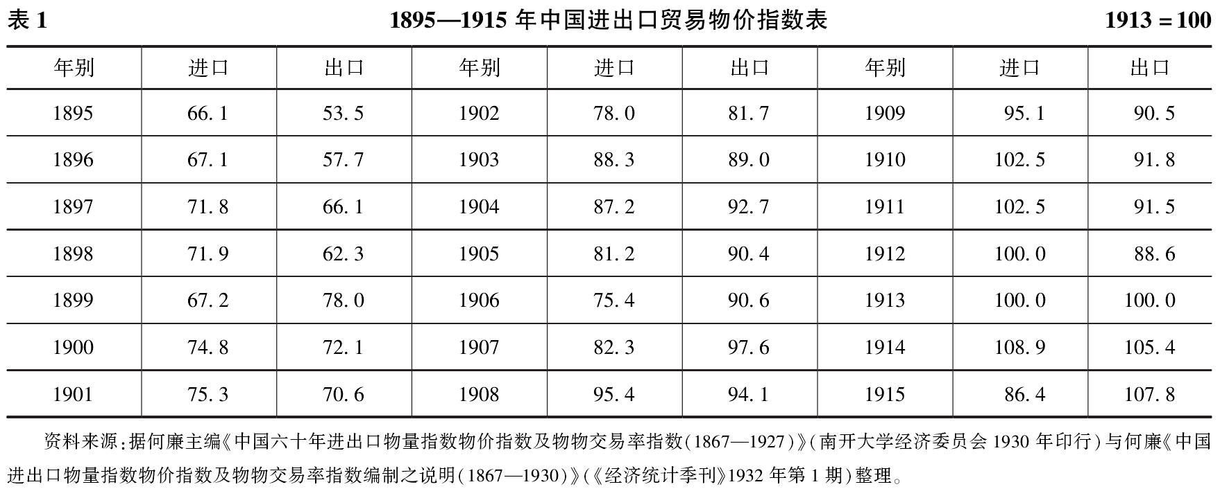 不可否认,旧海关资料以其编制时间长,内容广泛,表达方法科学,而成为研究中国近代史最为系统完整的资料,但是,由于记值方法和造册方式限制,海关进出口贸易统计数字存在的缺陷却是不容忽视的。因此,进行必要的修正就成为对其正确利用的前提。所谓“研究进出口贸易趋势及其相互关系,必须有物量指数和物价指数以为根据。否则对于贸易之涨落,殊难得一极准确之测试”。编制和利用进出口贸易指数,是较有效的修正手段。有关近代中国贸易指数,实业部国际贸易局、实业部统计处、南开大学经济学院、国定税则委员会等机构都有编制,但相比较而言,南开大学经济学院何廉主编的物量指数、物价指数及物物交易率指数无论从指数理论和实际运用上,都较之其他指数更为完善。因此,本文对1895—1910年间亚东关贸易额的梳理,均利用南开价格指数(见表1)对进出口货值作了修正。