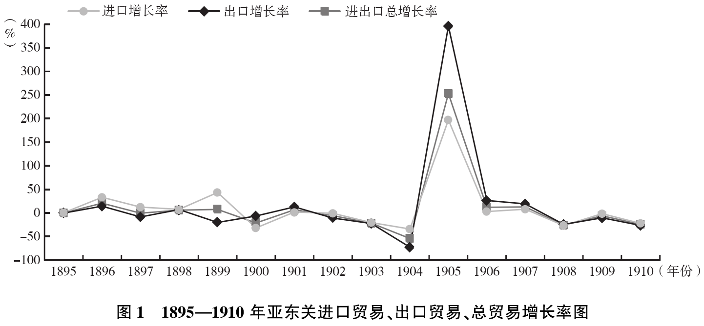亚东开关于1894年5月1日,于1914年3月闭关,因此,本文研究的时间断限理应为1894—1914年。但本文的研究是基于海关贸易统计资料进行的,1894年有统计的贸易数值是8个月而非一年,1914年的数据只有两个月,且不系统,又1911—1913年的海关统计数据不全,不能与1911年之前的数据完全比对。也就是说,受资料限制,我们实际上只能对1895—1910年亚东关的贸易增长趋势进行复原。但在进行对贸易趋势形成原因的探讨时,海关贸易报告有较为充分的关于1911—1913年贸易的记述,为此,我们可以将研究的下限定在1913年。