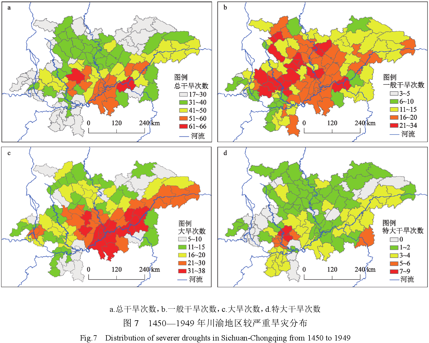 1450—1949年川渝地区受干旱影响较为严重区域(总干旱次数高于20次)大致位于秦岭大巴山以南即广元、巴中以南,绵阳、德阳、眉山、乐山、自贡、宜宾(东部)一线以东除黔江区、酉阳县、秀山县以外的区域,共111个统计单元;总体上与广元、雅安、叙永、奉节等地连接范围即四川盆地相一致,与研究区内长江、嘉陵江、岷江下游、沱江、乌江下游地区相重叠。数量上,除宣汉县干旱记录17次以外,其余各区县发生干旱均高于20次,重庆市境内长江沿岸区县、四川省境内嘉陵江下游、沱江中下游、岷江中下游地区次之,四川省境内长江以南、沱江上游、嘉陵江中上游、川东北地区相对较轻(图7a)。干旱程度分布,岷江(自贡、眉山仁寿县)以东、川东平行岭谷(涪陵)以西的丘陵山地以一般干旱为主(图7b),大旱以沱江中下游以东、嘉陵江中下游及长江沿线为最(图7c),