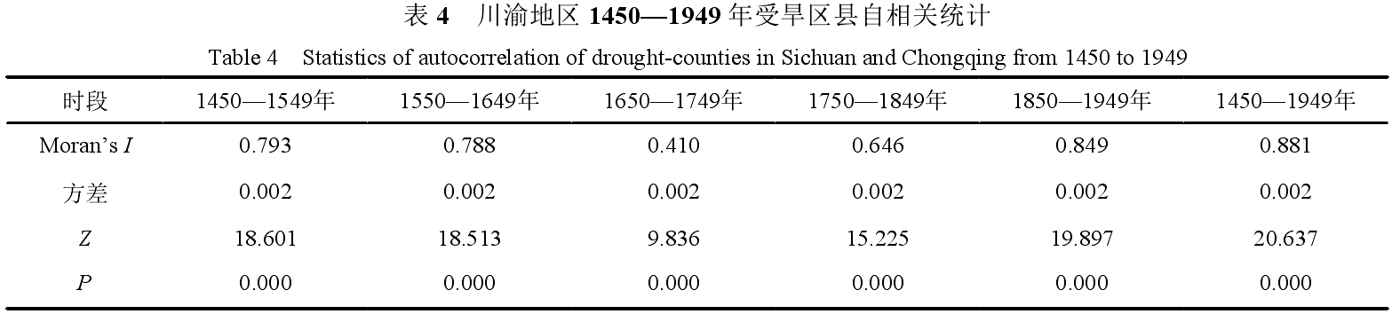 定义目标面要素只与共用边界或重叠的相邻面要素具有空间相关关系,并作行标准化处理,进行空间自相关分析(图6、表4),结果表明,川渝地区干旱分布具有空间自相关性,沱江中下游、嘉陵江中下游、长江重庆段两岸干旱频率具有高高相关性,川西高原及川西南山地则具有低低相关性,其余地区相关性不明显,即干旱频发地区和偶发区空间分布相对独立,盆地其余地区干旱具有一定随机性。川渝地区500a及各分段100a内,Moran’s I指数除1650—1749年为0.41、1750—1849年为0.645略低于0.7外,其余时间段均高于0.79,且Z值均远高于临界值1.65、P值均为0.000,亦说明研究区干旱空间分布聚集性明显。
