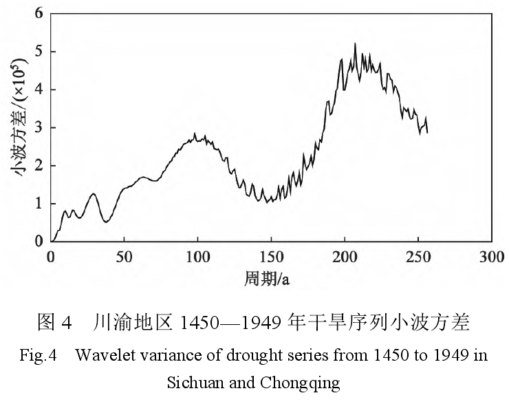 采用Morlet小波分析川渝地区500a干旱序列,结果显示川渝地区干旱存在多个振荡周期,以150~250a低频振荡和20~40a高频振荡周期较为明显,其中150~250a低频振荡在1450—1875年较为明显,存在约4个周期变化,分别为1470—1550年、1625—1680年、1750—1810年、1880—1949年(图3)。1450—1680年约有13个20~40a周期干旱过程,在1680—1780年干旱发生频率较低,在1900年以后,约有3个周期。从小波方差图(图4)可见,存在6个明显的变化周期,对应的年份分别为约200a,100a,65a、30a、15a、10a,其中约200a周期方差最大,最为明显,即川渝地区500a干旱序列以200a周期为主且存在一定波动,其次为100a周期,10~65a振荡周期亦较明显。