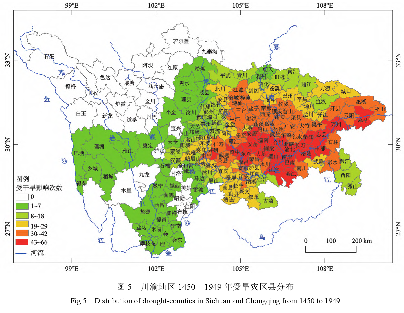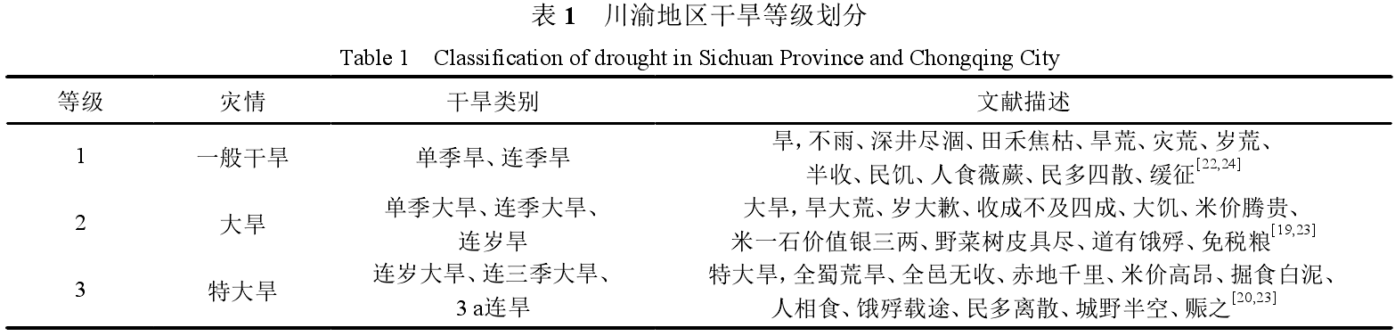 1)数据来源。本文资料主要源于地方志、水利志、档案文件、干旱灾害调查、现今旱灾史料汇编、旱涝分布图集和当今灾害论著,主要有四川和重庆各县县志及四川省志、《四川省水利志》、《成都水旱灾害志》、《四川水旱灾害》、《四川省近五百年旱涝史料》、《中国近五百年旱涝分布图集》、《中国三千年气象记录总集》、《中国气象灾害大典·四川卷》和《中国气象灾害大典·重庆卷》等。在分析和整理旱灾资料时,尽可能地使用能相互印证的史料文献,务求数据来源可靠、准确和完整。