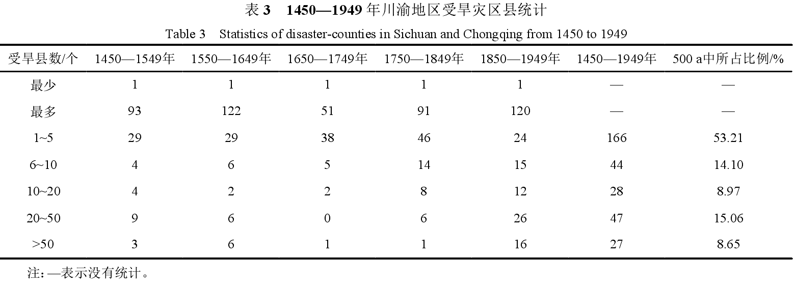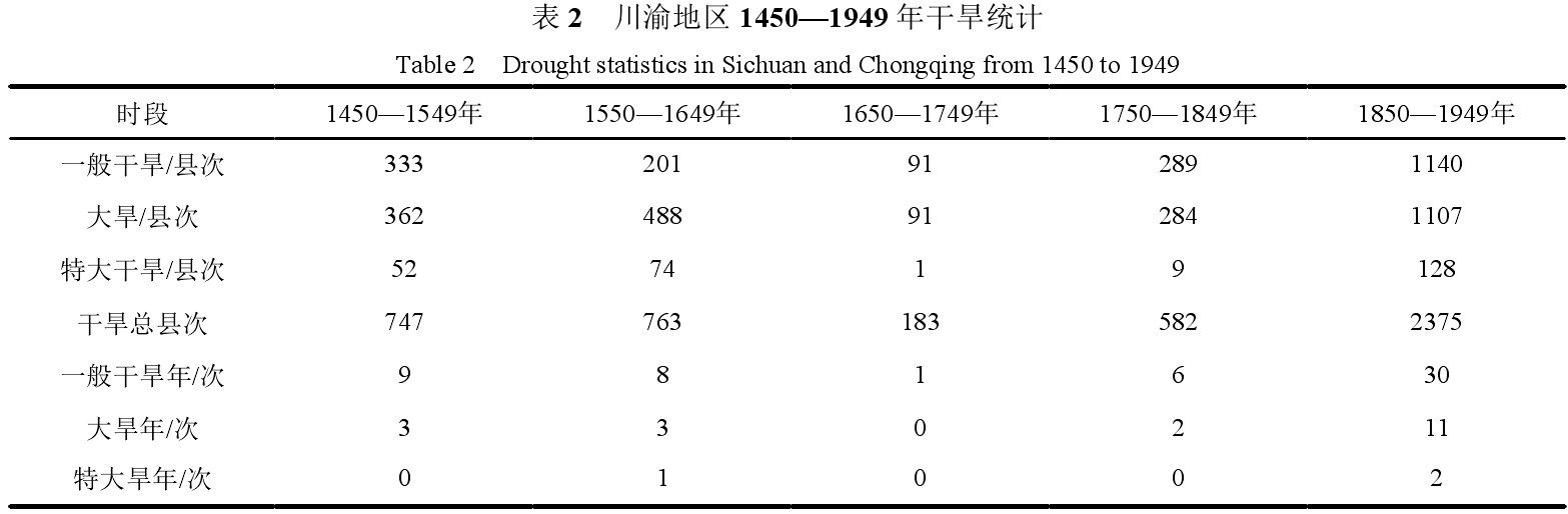 通过统计川渝地区1450—1949年干旱发生时间和范围,分析干旱时空变化特征,结论如下。