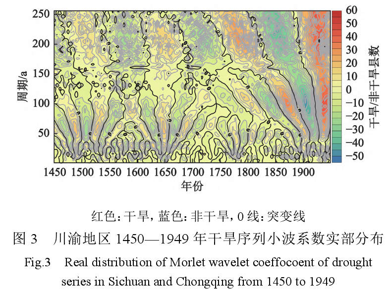 小波分析能清晰地揭示出隐藏在时间序列中的多种变化周期,充分反映系统在不同时间尺度中的变化趋势。将时间域上关于尺度的所有小波系数的平方进行积分,即小波方差,小波方差图能反映波动及其能量大小随尺度的变化特性,方便查找一个时间序列中起主要作用的时间尺度,即主周期,时频局部化能反映时间序列精细结构,广泛应用于水文、气象时间序列周期分析。文中利用212个区县干旱资料、以年为单位构成干旱时间序列,采用Matlab 8.3软件分析川渝地区1450—1949年干旱周期,用ArcGIS 10.2软件分析其空间分布。