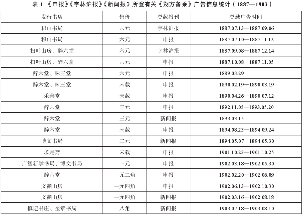 综合广告词与销售情况来看,可以说积山书局在社会整体关注边徼事务的背景下,敏锐地捕捉到了这一商机,直接推动了石印《备乘》的发行,其后的扫叶山房与醉六堂两家则承担了分销的任务。类似的经营现象广泛存在于晚清上海书籍市场中,在印书成本高于一家书局的承受能力时,印书者便可能选择预付书款、多家合资等形式筹集启动资金,在印行后再将书籍交由其他书局分别销售。通过新技术的应用,初版石印《备乘》的售价就被控制在了一个较为容易被普通读者接受的水平,以《五经备旨》《康熙字典》一类的常见科场用书作比,《备乘》的售价也并不十分高昂。由此,石印《备乘》正式进入晚清书籍市场,并且在随后数十年间逐步扩展到更多晚清读者的阅读清单中,表1统计了光绪七年至20世纪初于上海各报上刊登的《备乘》广告。