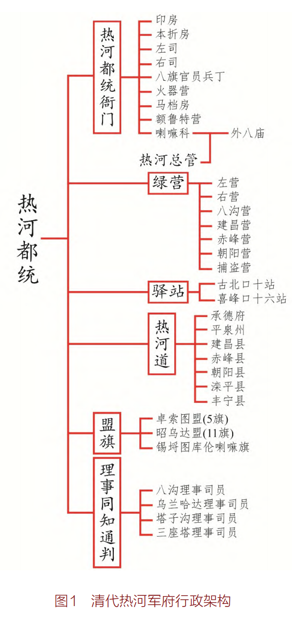 热河在清朝初年原属蒙疆,但因清帝北巡需求在此相继设立木兰围场与避暑山庄,并派驻八旗官弁。后随着内地移民大量进入,热河从游牧地区逐渐转为农耕、游牧交错地区。为适应这种变化,清廷采取二元统治——将府州县制推广至当地,管理汉族移民,隶属直隶省,而以旧有盟旗制度管理蒙古族。后由于行政效率不佳以及蒙旗下层生计问题,清政府借鉴察哈尔、乌鲁木齐的管理经验,于嘉庆十五年(1810)将原有热河八旗驻防改设为军府,热河副都统升为都统直接管辖热河一地的旗、民或蒙、民案件,集行政、军事、司法权于一身(见图1)。