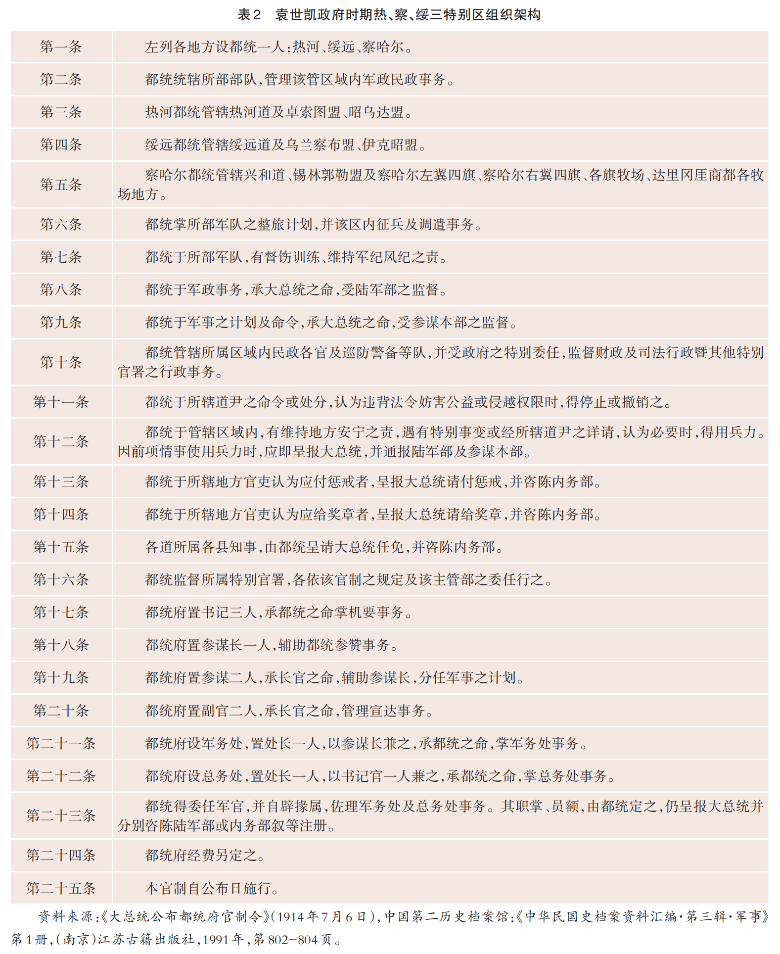 热河特别区与民国初年省制差异之处在于:第一,行政制度上,袁世凯就任大总统后,与国会就地方行政制度改革进行角力,但始终未能达成共识。后袁世凯政府于1913年1月8日,不经参议院同意,擅自颁布《划一现行各省地方行政官厅组织令》《划一现行各道地方行政官厅组织令》《划一现行各县地方行政官厅组织令》。又于1914年5月,公布《省官制》《道官制》《县官制》。这两次命令,使当时地方行政组织呈现省、道、县三级制的框架。笔者根据相关资料绘制《热河特别区行政架构图》(见图2),可看出当时热河也属于三级制。但与内地省制不同的是,热河特别区保留盟旗制度,继承清代原有二元治理模式。第二,清朝时期热河隶属直隶省,热河都统虽为热河地区最高行政长官,但在名义上仍受直隶总督管辖,遇有重大事情需与直隶总督会商。根据《热河官厅组织暂行章程》第17条,这项旧制即使在热河从直隶析出后仍旧保持,与内地行省不同。这可能是袁世凯政府认为当时热河并不完全具备设省条件,而且在民政与军政方面与直隶关系密切,与直隶总督会商制度仍需保留。第三,军事防务上,根据《热河官厅组织暂行章程》第13条,热河境内军队直接隶于都统,其一切编制法律依内地行省行规制定。但因热河境内仍有部分八旗与绿营,仍照旧制暂时保留,可见热河特别区仍部分沿袭过去清代热河军府制度。差异之处是另设镇守使制度,此官职是民国时期北洋政府为笼络地方实力军阀和绥靖地方而设立的一种临时军政职官,镇守使署一般设于边疆和重要城市,通常由所在地握有兵权的陆军旅长、旅旅长或师长充任最高军事长官,执掌辖区内军政事务,部分还兼管民政与外交。民国肇建时,袁世凯政府及后来的北洋政府于国内重要地方,或因所在省份军政长官请求,或因环境需要,先后设置镇守使。镇守使制度看似给地方割据提供机会,但镇守使由中央指派任命,军队驻地由中央规划,其饷糈支出亦由中央负责,这样中央政府才能在最大程度上保持对各军队的控制。第四,官厅组织上,根据《热河官厅组织暂行章程》第10条,“热河所属各县地方行政官厅制,依内省现行划一地方官厅组织令行之”,因此在官厅组织上也与行省相同。唯一不同的是,该年由袁世凯公布之《都统府官制令》第15条提到“各道所属各县知事,由都统呈请大总统任免,并咨陈内务部”,且都统所辖官员之奖章、惩戒均呈报呈报大总统,可见特别区之官员任命与奖惩仍由中央掌握,是其与行省不同之处(见表2)。