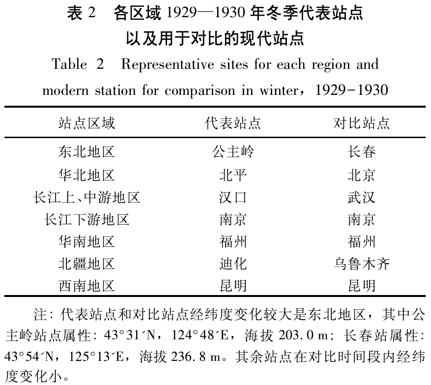 此外,在每个站点区域中选取1个代表站点,并收集该站点的现代器测数据(现代无站点则选取经纬度相近站点),统计站点的逐日最低温度,计算各温度对应的累积频率与重现期,用以判断1929—1930年严寒事件在不同区域的极端程度。现代气象数据来源于中国气象数据网(http://data.cma.cn/),序列覆盖时段为1951—2013年(部分站点为1978—2013年);内容为各站点逐年1—2月、11—12月的最低气温与平均气温。代表站点选择如表2。