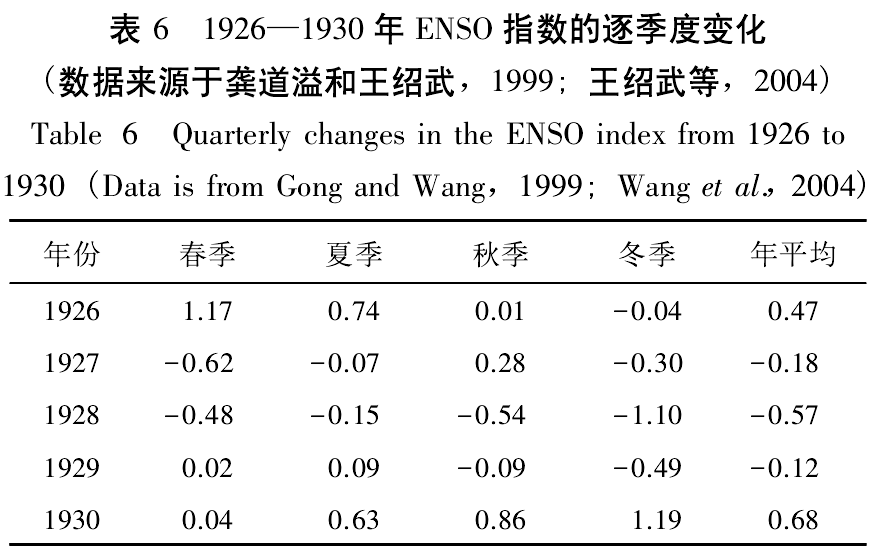依据龚道溢和王绍武(1999)、王绍武等(2004)重建的1867年以来的各季度ENSO指数结果(表6)可以看出,自1926年冬季开始,ENSO指数就开始由正转负;1927年中,除了秋季为正指数外,其他季度均为负指数,年平均值也低于0;1928年全年为负指数;1929年春夏季出现较弱的正指数,但秋冬季又转回负指数,且本年冬季是该年负指数最强季度;1930年起,指数转为正。
