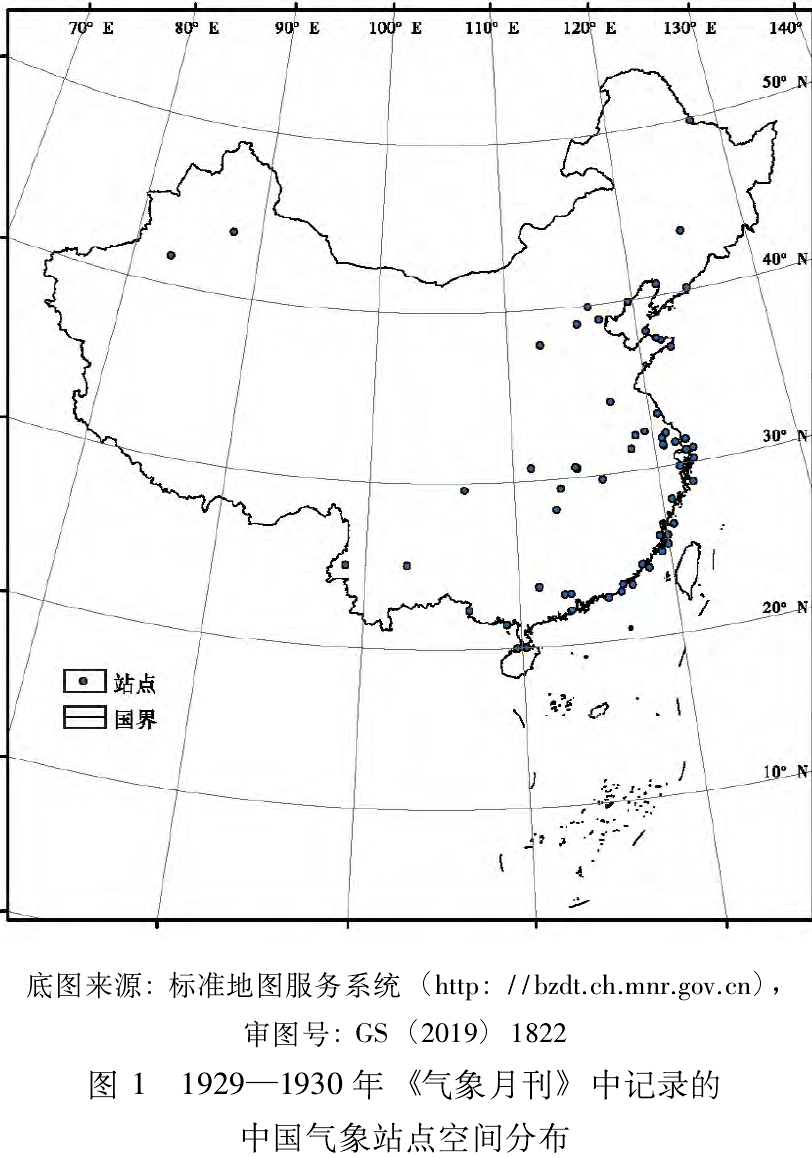 本研究所采用的1929—1930年器测资料来源是民国时期国立中央研究院气象研究所出版的《气象月刊》(Monthly Meteorological Bulletin)。该刊物的核心内容为当时中国多个站点的气象要素观测资料。其权威性高,覆盖空间范围广,时间分辨率高(大部分站点达到“天”尺度),气象要素齐全且测量规范,是研究该时段内气候变化与气象灾害的良好资料源。对于该研究时段内,从《气象月刊》中分别提取站点名称、经纬度信息、逐日最低气温,删除其中印刷污损严重、无法识别或通过均温、最高温推算的数据,共得到61个站点6692条站点日最低气温记录,资料完整程度高达91.4%。站点分布如图1所示。