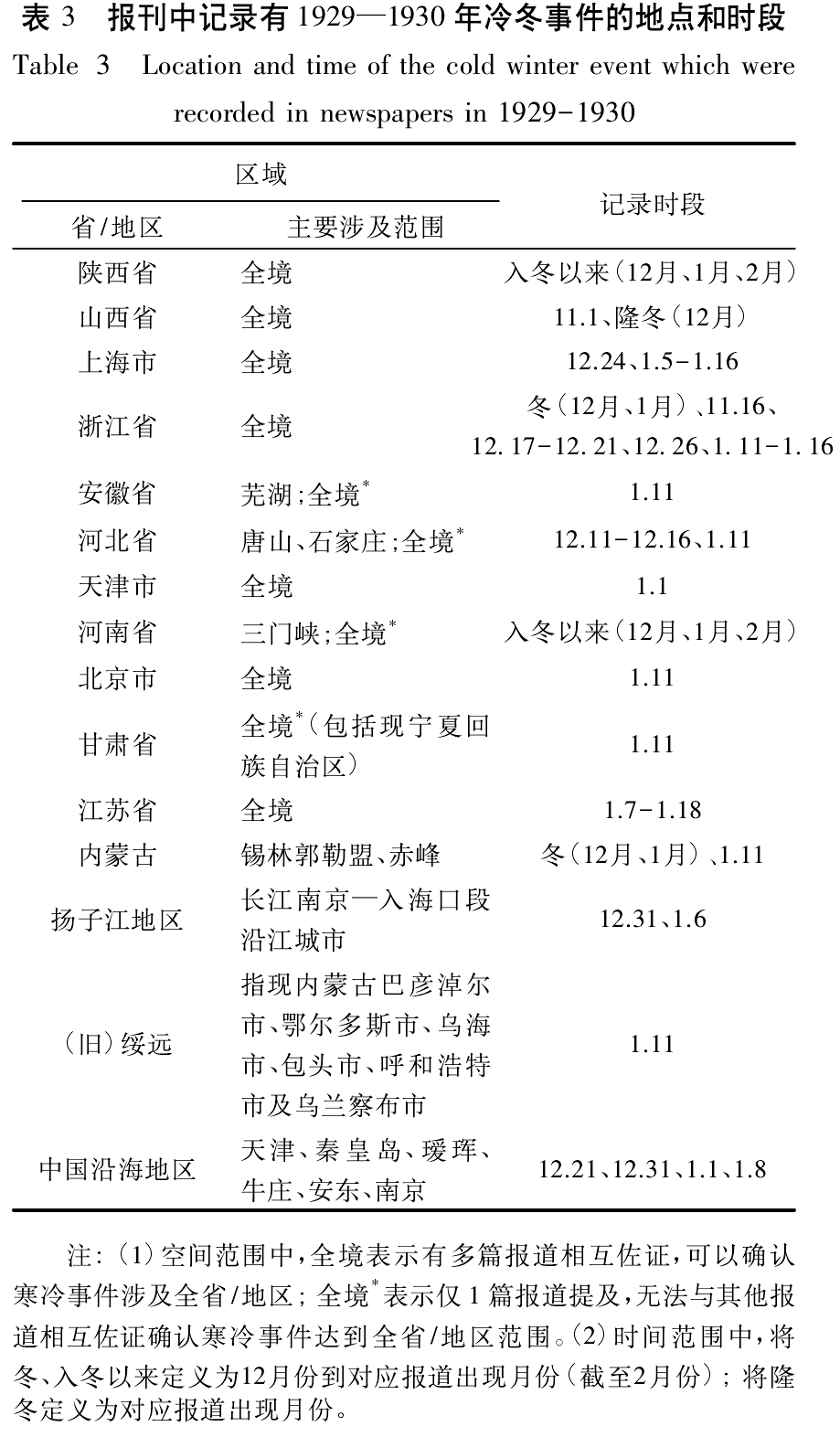 报刊资料存在“报道异常而不报道平常”特点,一般的寒冷事件并不会作为新闻出现在报纸报道上,故认为出现在报道中的寒冷事件程度相对严重。本研究结合上文划定的研究时段(1929.11—1930.2),以“严寒”“气温”“冻馁”等作为关键词,分别对翰堂近代报刊数据库和《民国时期水旱灾害剪报》进行阅读查询和精确查询,筛选涉及本时段内的寒冷事件报道,共计获得147条记录。前者共获得120条记录,后者共获得27条记录。对于每条记录,分别提取其报道出处、寒冷事件时间、寒冷事件地点与寒冷事件描述;删去其中缺少寒冷事件地点描述、关键词重复的记录,得到59条可用记录。将整理获得的59条记录分别从时间、空间纬度进行汇总,得到报刊报道的本次冬季严寒事件发生的空间范围,以及每个省区涉及严寒事件的时间段(表3)。