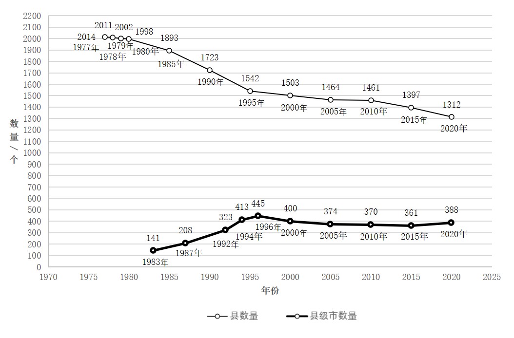 图1 “县”与“县级市”的数量变化(1977~2020年)