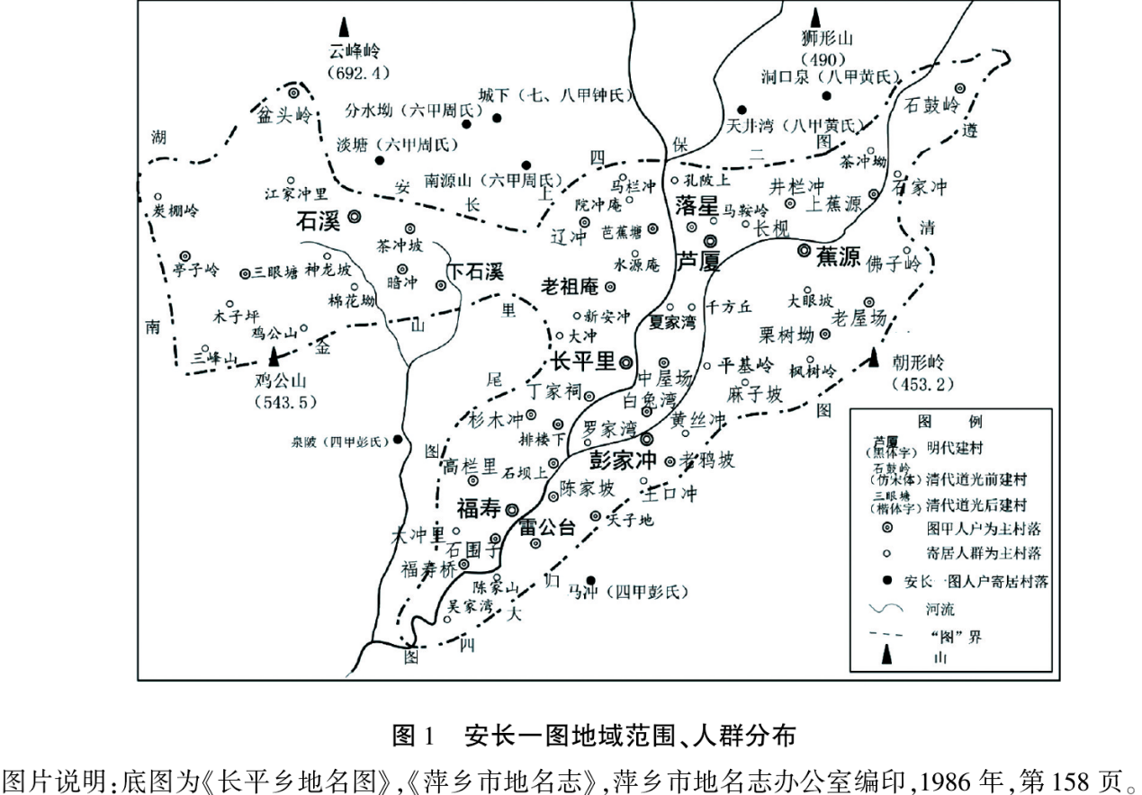 据此,结合族谱、地名志等资料,其地域范围可在现代地图上较为精确地复原,详见图1。清代县以下政区的边界延续性强,“图”的边界仍为当代省界、乡界。究其原由,清代“图”的边界划定基本依据自然界限。安长一图的东、西、南面均以山川为界,东北角遵循河流的延伸范围。“山川形便”亦体现在清代“图”这一县以下政区之上。
