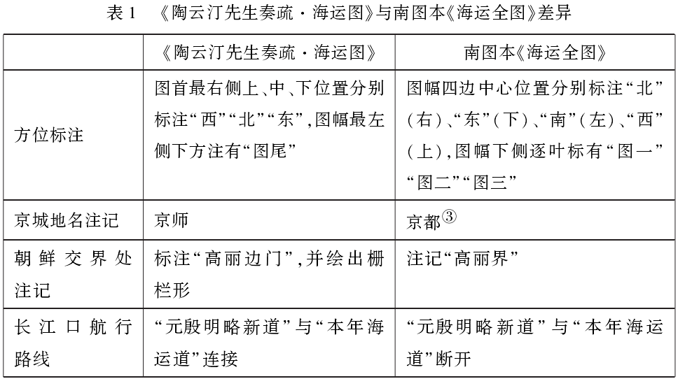 近期笔者进一步查阅资料发现,国家图书馆与南京图书馆均藏有一册刻本《海运全图》,尚不为学界所熟悉,经对比,二者属同一版本(本文主要引用南图本),均由一幅“海运全图”和对应的“图说”构成。“图说”部分即上述陶澍奏折中的文字,但“海运全图”则与奏疏本的“海运图”存在较多差异,详见表1: