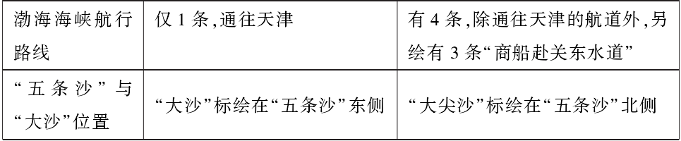 (一)“黑水洋”与航线位置。在“图说”描述的航道第三段中说,“自佘山驶入大洋,向正北微偏东行,至通州吕泗场对出之洋面,约二百余里,水深十丈,可寄碇。从此以北,入黑水大洋”。按此说法,南图本在佘山附近航线处标明“本年海运由吴淞口至崇明十滧放洋,东向佘山,转北入黑水大洋”,吕泗外洋处标明“江境近西之水多黄河泥沙,水黄色,自吕泗外洋以北为黑水大洋,水黑色”,与“图说”高度呼应。而在奏疏本中,并未出现上述两段注记,且将“黑水大洋”标注在沙头山以北海域。