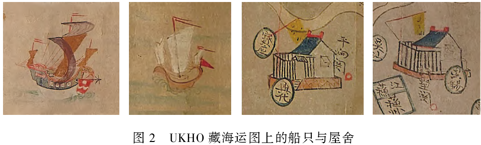 除《江海全图》外,英国海道测量局档案馆藏的一幅匿名彩绘本海运图也可作为例证(以下将该图简称为“UKHO藏海运图”)。该图上川沙厅已有,定海县尚未改为定海厅,可知描绘的仍是嘉庆十五年至道光二十一年间的海疆状况。图上同样绘制了多处沙船,并绘制了大运河。尤为特殊的是图上浒墅关、平饷关、镇海、利津四处标绘了非常形象的屋舍,造型突出(见图2),极有可能代表的就是仓廒。
