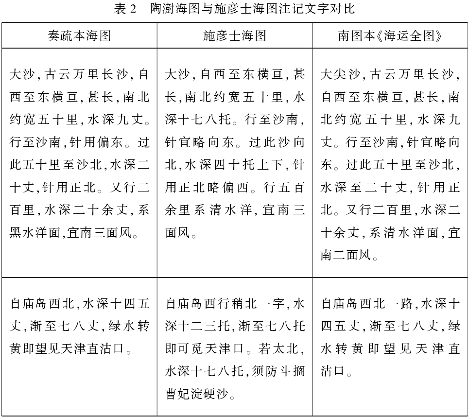 表1所列外,还有诸多地名以及沙线的差异,不一一赘述。那么究竟哪一个版本才能体现陶澍呈送道光帝的海运图原本面貌(或者说更接近原本)呢?笔者从图说角度分析图面内容,认为南图本《海运全图》的可能性更大,以下分述缘由: