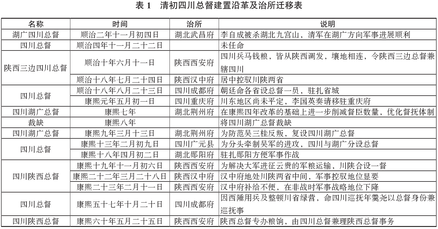 清初四川总督建置及其治所迁移,除了受到军事因素影响外,督抚体制的整体调整因素也不容忽视。作为职官体系的一部分,以督抚为代表的大员在清初的整个国家官制调整中占据着重要地位,且与顺康年间的政治形势与权力争夺密切相关,特别是关于督抚关系的定位会影响总督体制及治所的变迁,因此,尚需从职官调整的视角入手,对这一时期的四川总督建置及其治所变迁进行分析。