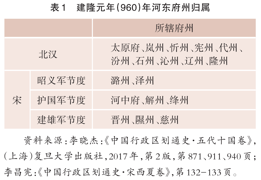 自后周立国至太平兴国四年五月,今山西中北部地区一直有北汉政权的存在。宋初以节度使领诸州,河东诸府州主要为北汉以及北宋之昭义军、护国军、建雄军三节度使分辖(详表1)。