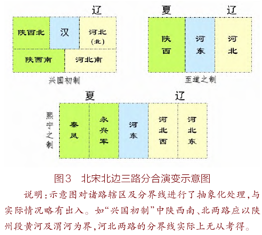 不同于其他诸路的是,北边三路前后的分路方式是截然不同的。与其他诸路相较,北边三路的分路方向除了会受分路后财税是否均匀影响外,又因临边而更受宋廷与其对抗政权间对峙方向之客观因素的影响。对峙方向直接影响作战时的进军方向,以及防御时的合理军事部署。而北边三路的划分方向,既需要利于转输内地物资至战区,以配合军事部署,便也会受到对峙方向的影响。故而在对抗政权的位置发生转移后,北边三路的分路方式自然也会随之转变,这便体现在“兴国之制”与“熙宁之制”的差异上。