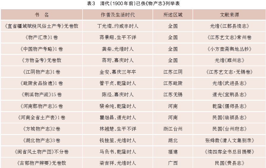 到了清朝,《物产志》的创作特为兴盛。《中国农业古籍目录》著录的主要是1900年之后的作品,实则不独步入近代社会之后,清朝前中期已有不少《物产志》问世了,只是大多已经亡佚,仅以存目的形式寄存在各地方志《艺文志》中,信息比较散乱隐晦。本文钩沉得13种(见表3),著述年代大约始自乾隆时期,降至光绪时期(1900年前)。从命名方式看,《物产志》是比较通行的名称,也作《土产志》《土产表》《方物考》《物产图》等;从涵盖地域来看,涉及江苏、河南、浙江、福建、江西、湖北等地,覆盖面较广,其中《直省疆域赋税风俗土产考》《物产汇录》《中国物产考略》《方物备要》等更是全国性质的物产专志;从创作时间来看,乾隆、嘉庆、道光、咸丰、光绪五朝中,每一时期都有《物产志》问世。上述几点均可看出清代前中期《物产志》创作之风的兴盛。
